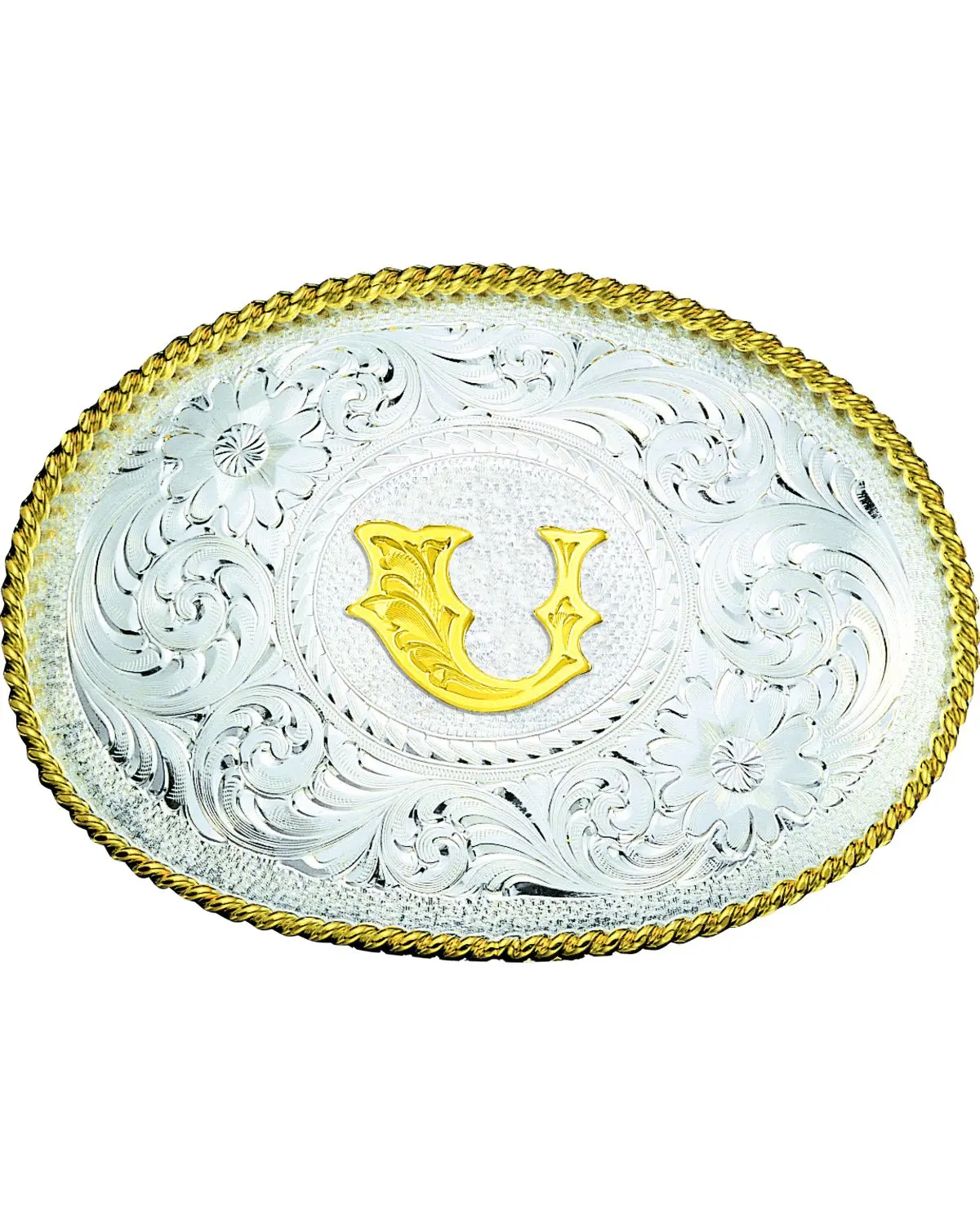 Made of gold and silver electroplating over a nickel alloy base. Gold twisted rope trim. Engraved gold letter in western style font. Fits onto a standard 1 1/2" belt swivel. Measurements: 2 3/4" x 3 3/4". Made in USA. Vendor Style: 700U.