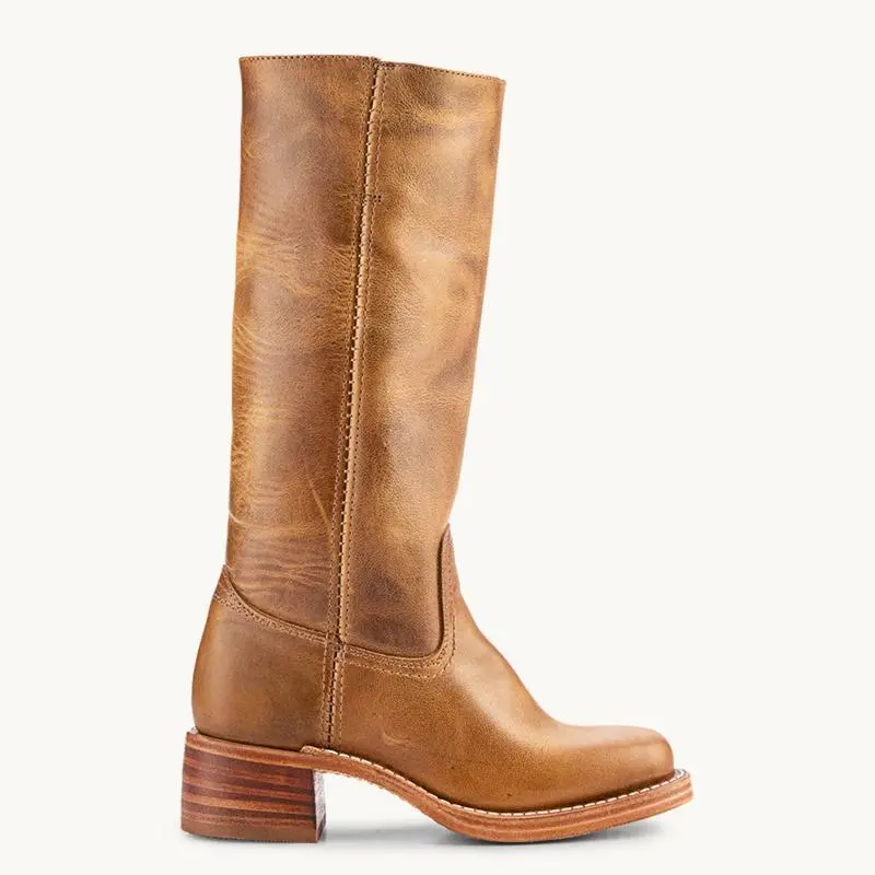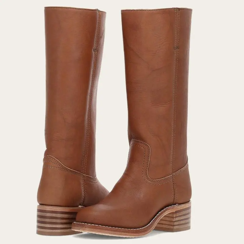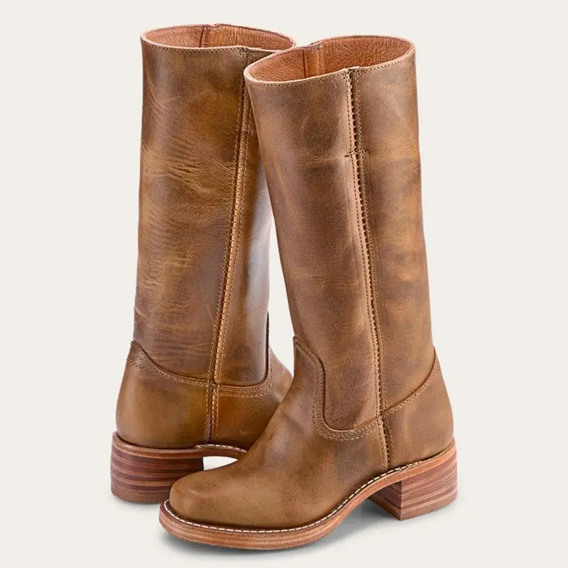 Women's Banana Mid Calf Boots Chunky Heel Western Square Toe Ladies Comfortable Riding Fall Casual Biker Footwear Brown Walking Shoes Girl