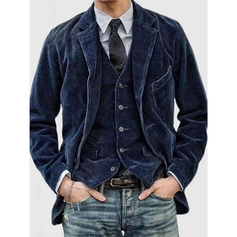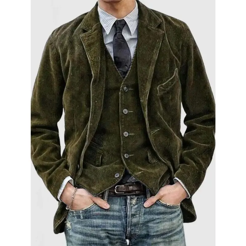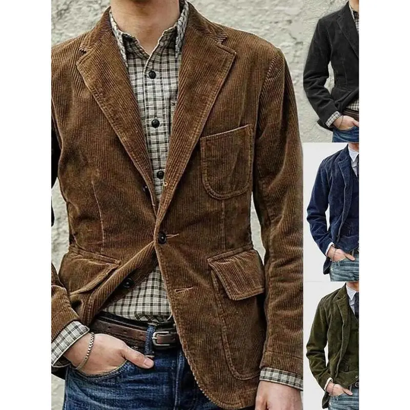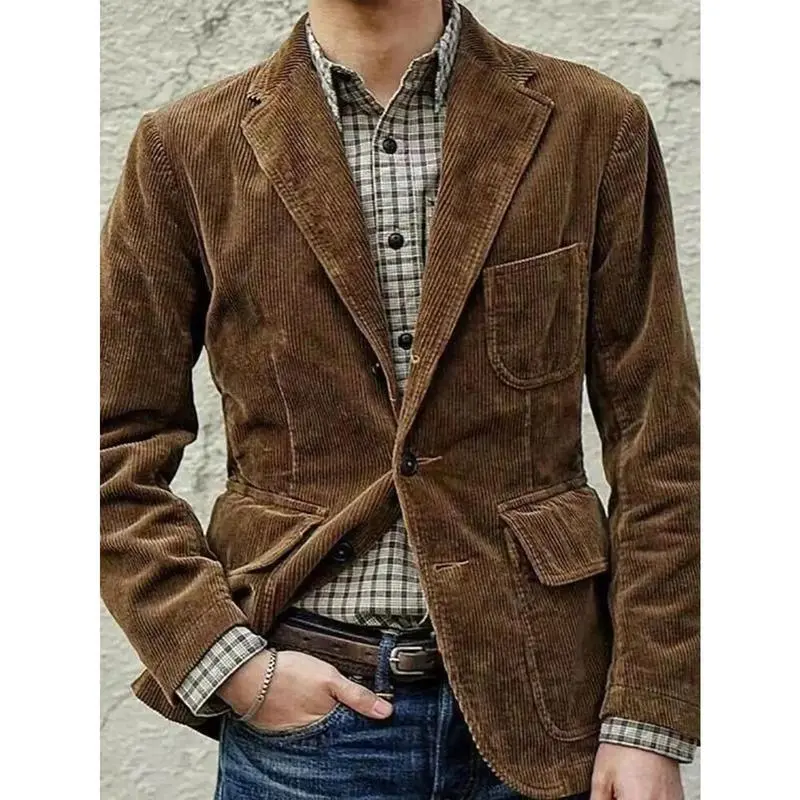 Men's Corduroy Blazer Jacket - Iron-Free Casual Single with Notched Lapel | Brown front button jacket for all seasons Hand wash and dry clean
