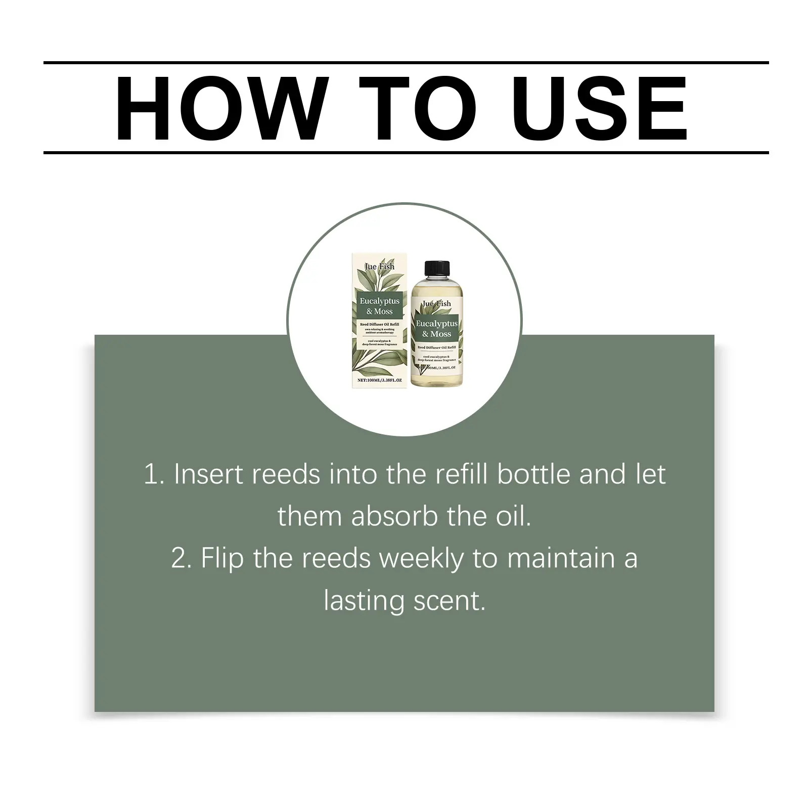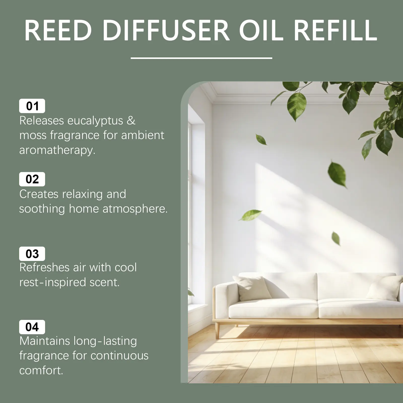 Our eucalyptus moss scented essential oil is carefully formulated with eucalyptus oil and fragrance. It is designed to produce a soothing aromatherapy effect. It is extremely easy to use: 1. Insert the diffuser stick into the refill bottle and let it absorb the essential oil. 2. Flip the diffuser stick every week to maintain a lasting fragrance. It also provides a long-lasting scent, with the cool eucalyptus aroma bringing a fresh forest atmosphere