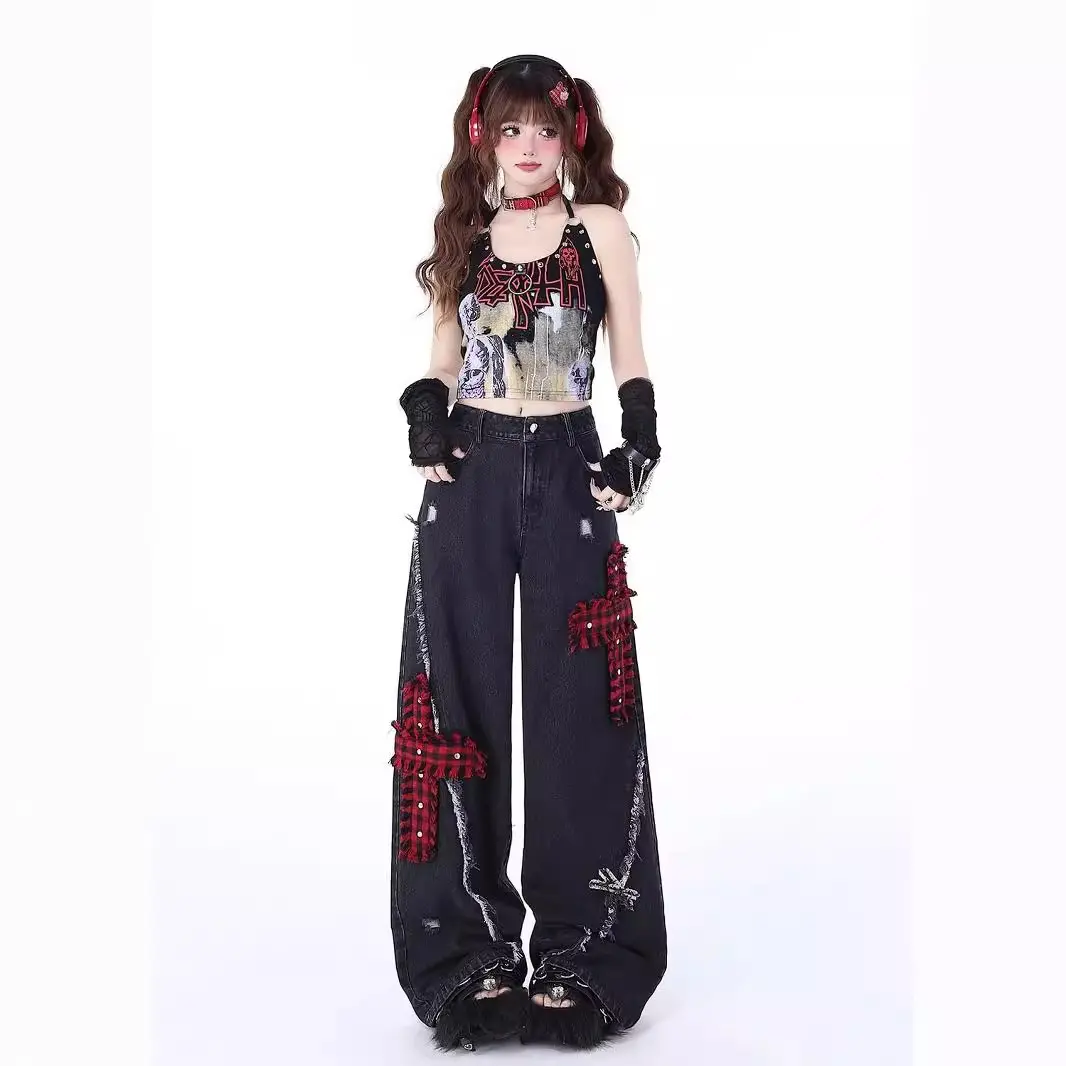 Women's Rock Punk Ripped Jeans, Spring New High-Waist Wide-Leg Pants, Loose Embroidered Floor-Length Denim, Drapey Casual Bottoms