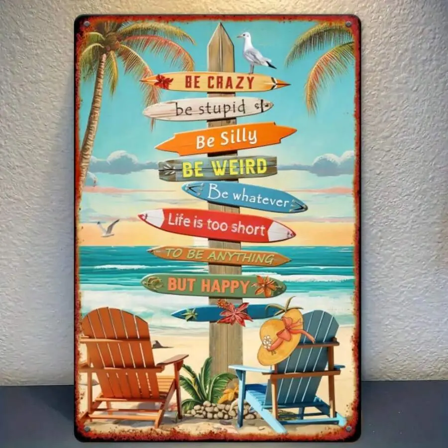 Bring the relaxing vibe of the beach into your space with thisRetro Beach Surfboard Metal Tin Sign.Featuring aninspirational quotepaired with a vintage-style surfboard design, this8x12 inch tin signadds a cool, coastal feel to any room.Ideal forbeach houses, cafes, bars, or even as a unique gift, this wall art brings a dose of motivation and nostalgia to your décor.