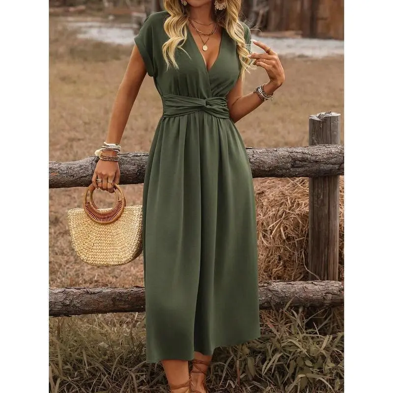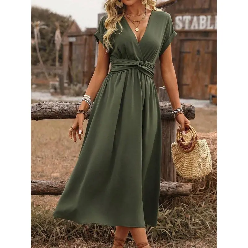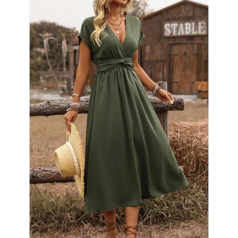 Sleeve Type: Batwing Sleeve Hem Shape: Flared Waistline: High Waist Details: wrinkles, distortion Inner lining for added warmth: No Pattern Type: Solid Color Main body: Unlined Color: Army Green Sleeve Length: Short Sleeve Suitable Type: Regular Fit Material: Machine-woven fabric Composition: 100.0% Polyester Maintenance Instructions: Machine Wash Or Professional Dry Cleaning