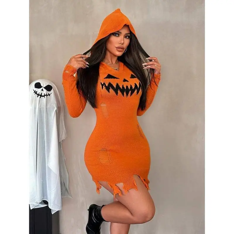 NewHalloweenPumpkinTeethGraphicOrangeSexyHollowOutTasselHoodedBodyconSweaterDressForWomenFallWinterClothForWomen.