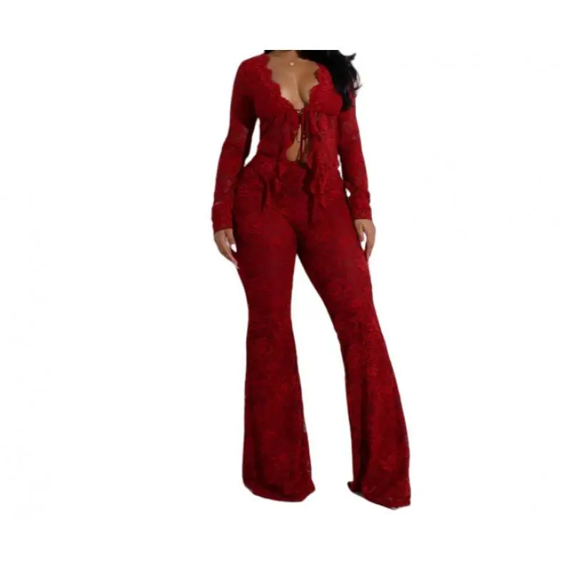Size Type:Plus SizeComposition:70%(Inclusive)-80%(Exclusive),SpandexSeason:SpringPattern:Plants Size Type:Plus SizeComposition:Spandex,70%(Inclusive)-80%(Exclusive)Style:Street,Street Style,Pants SuitSeason:SpringPattern:Plants -red lace set with V-neck cardigan & high-waisted flared pants. Delicate sheer paneling and crisscross back detailing create elegant contrast, styled with gold chain accents for # NightOutStyle. The contoured silhouette flows through waist-defining tailoring, for date nights or cocktail parties. Breathable knit fabric allows movement while maintaining sophistication during evening events. 's trending # LaceFashion pairing transitions seamlessly from rooftop bars to gala dinners. Romantic cutout patterns align with viral # EveningOOTD content, styled with strappy heels for leg-lengthening effect. Machine-washable luxury fabrics maintain intricate lacework through multiple wears.