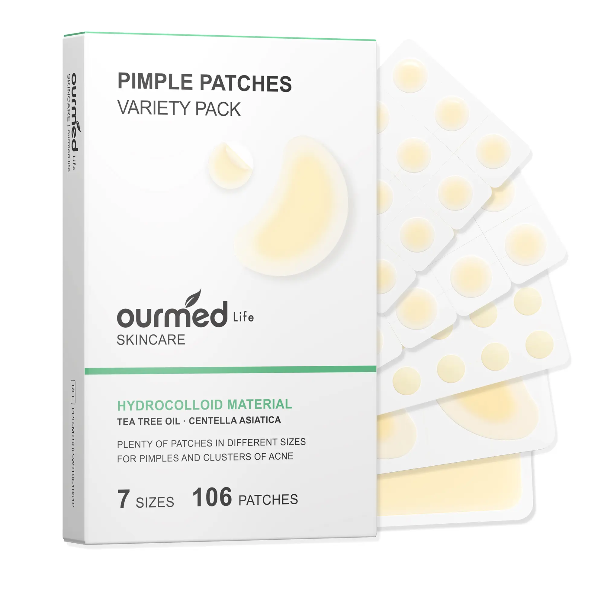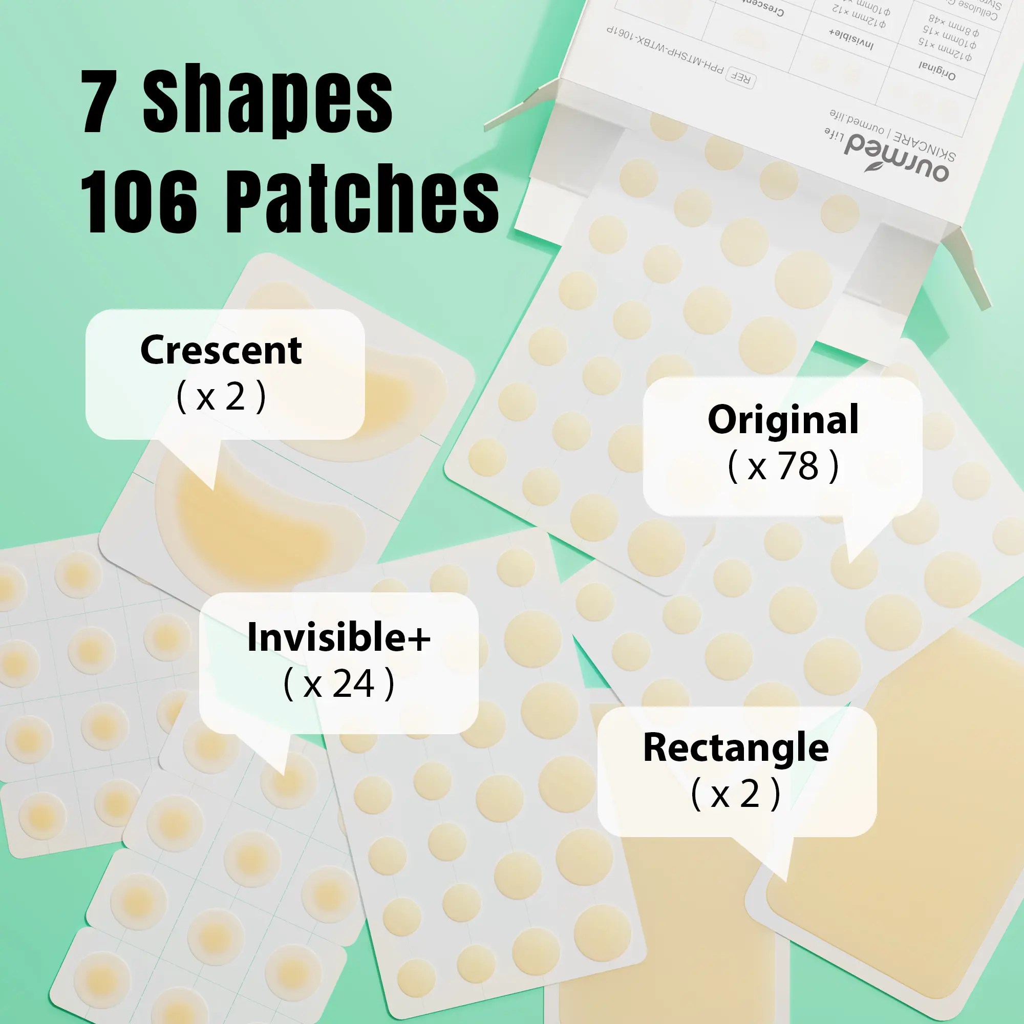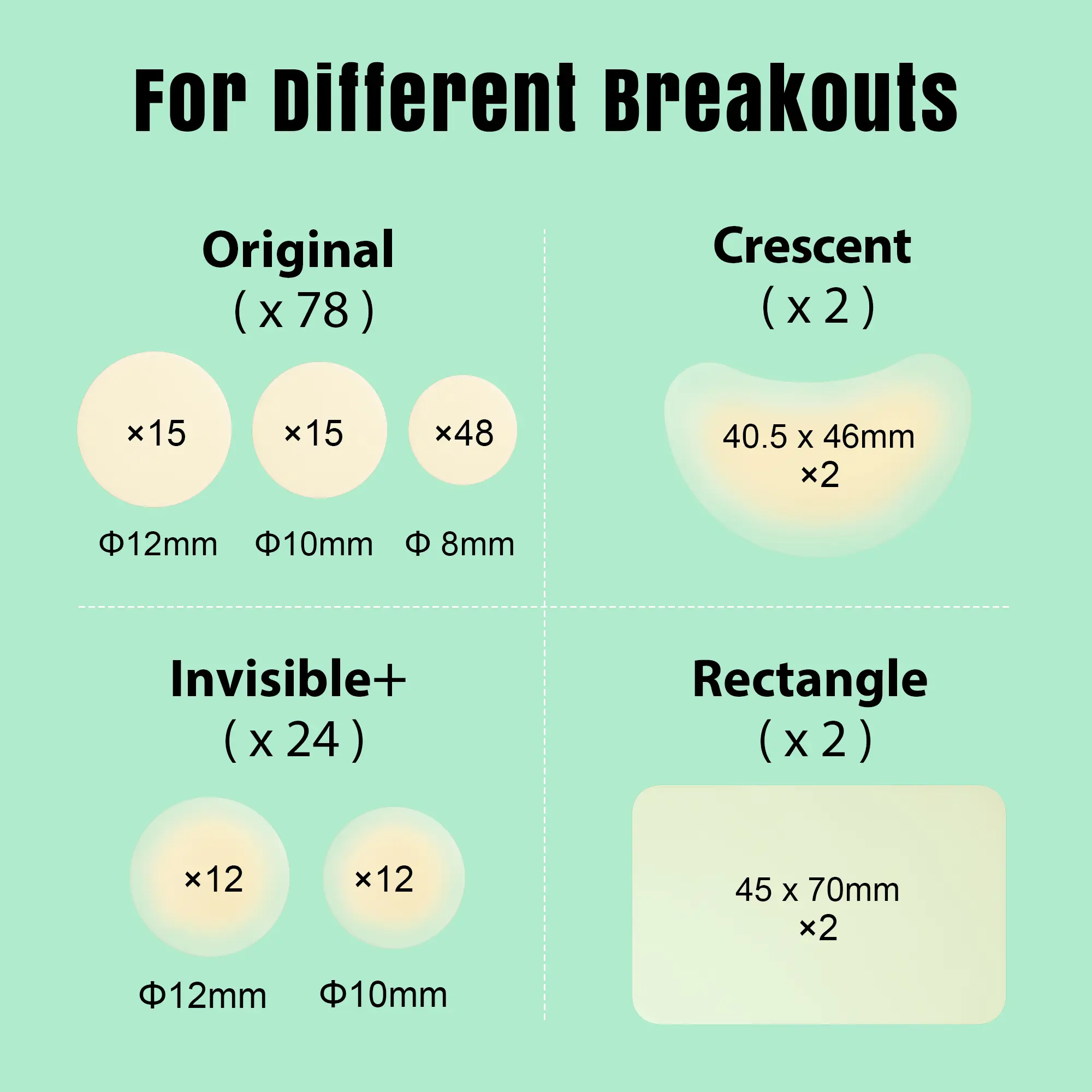 ·crescent and rectangle patches (2 each). This variety covers single zits, clusters, and hard‑to‑reach areas so you always have the right patch on hand.