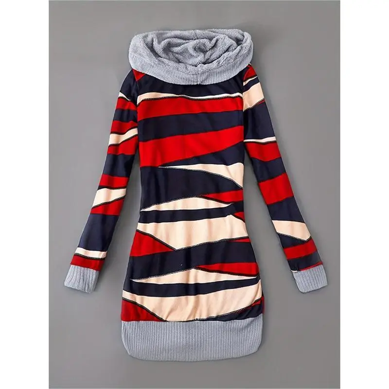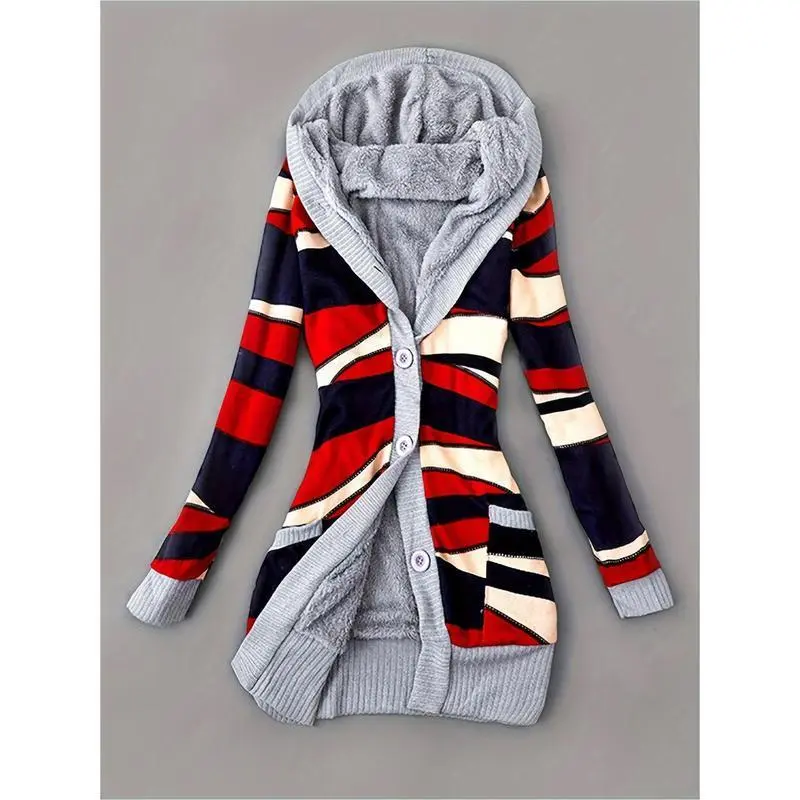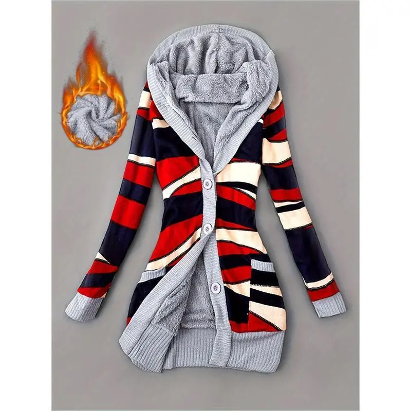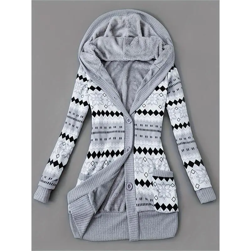 Fashion Women's Geometric Pattern Knitted Long-Sleeved Thickened Coat, Mid-Length Hooded Cardigan with Pockets, Lined with Fluff, Warm and Comfortable, Suitable for Outdoor Wear in Autumn and Winter, Women's Clothing