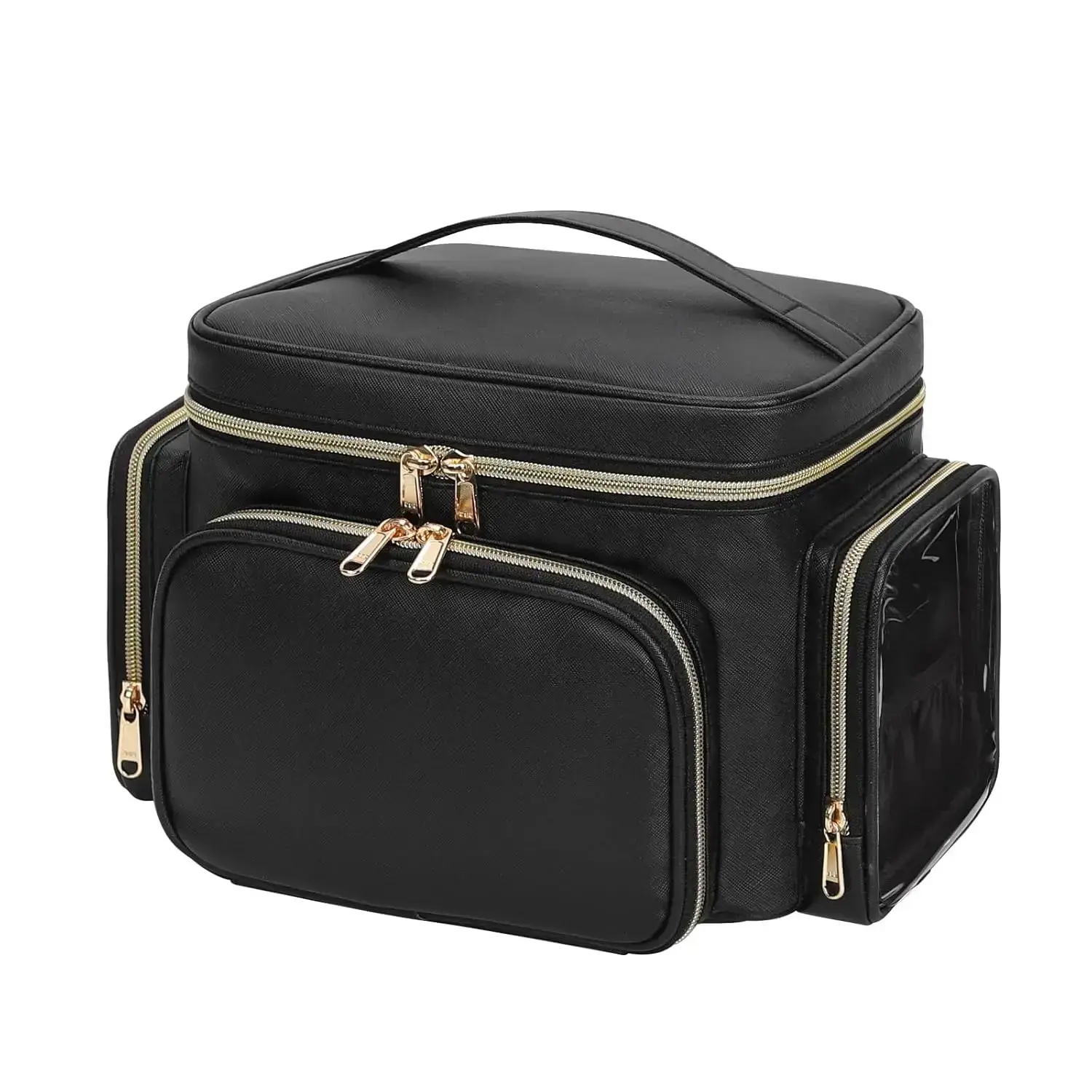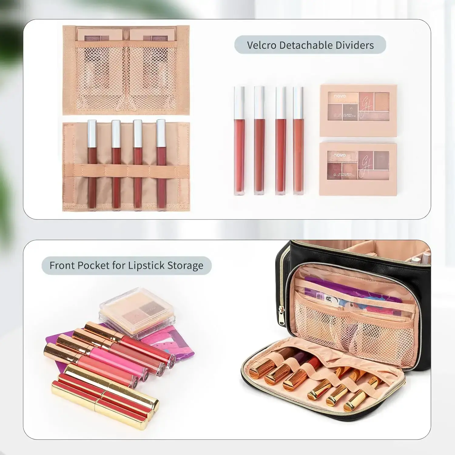 Large Capacity Cosmetic Bag - Our makeup bag is spacious and deep enough to hold bottles vertically.With two removable dividers to better organize all your cosmetics and personal belongings, you can also adjust the space as needed! Separate Makeup Brush Compartments - The makeup bag organizer top lid features a makeup brush compartment for multiple makeup brushes of different sizes, extra velcro PVC cover to protects the organization from powder dust and easy to clean make-up stains! Multiple Pockets & Versatile Design - The travel makeup bag is designed with a large front pocket with 6 lipstick pouches and 2 mesh pockets 1 large PVC pocket, as well as 2 side pockets for storing all travel-size toiletries, cosmetics and accessories, etc. Durable & Waterproof Material - Made of premium water-resistant pu leather material and durable double zippers, the whole makeup bag is padded to protect your cosmetics during transportation.Also equipped with a handle for easy carrying. Popular Cosmetic Travel Bags - Richly structured and practical, our cosmetic bag is perfect for daily use, outdoors and traveling. It can be used as a birthday gift, Christmas gift, graduation gift, anniversaries gift and Valentine's Day present.