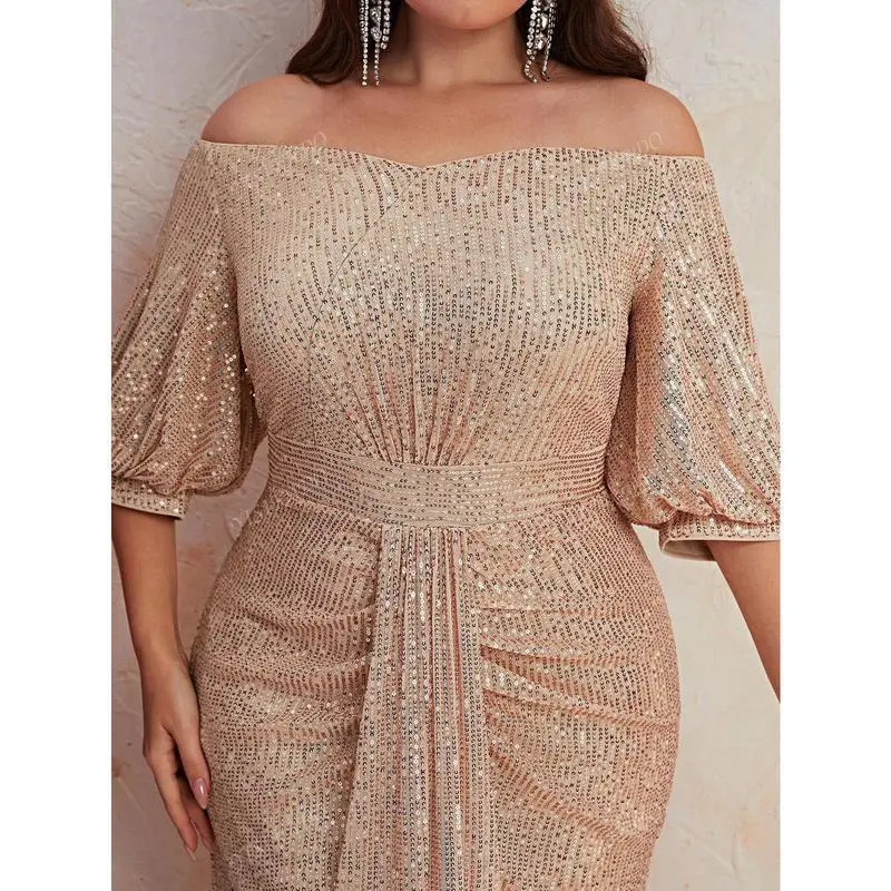 ?? Elegant Women's Plus Size Dress ?? This formal dress is perfect for prom, weddings, and graduations. It features a draped, ruched design with an off-the-shoulder neckline. The high waist and zipper detail add a stylish touch. The puff sleeves and mermaid hem shape create a fitted look. Ideal for party, formal, and evening occasions. The dress is available in champagne with a plain pattern. It's a three-quarter length, slim fit maxi dress. Material and Care ?? The dress is made of 95% polyester and 5% elastane, offering slight stretch. It is not sheer and requires hand washing; do not dry clean. The sequin fabric adds a touch of elegance. This basic, minimalist dress is suitable for workwear and special occasions. Key Features ??