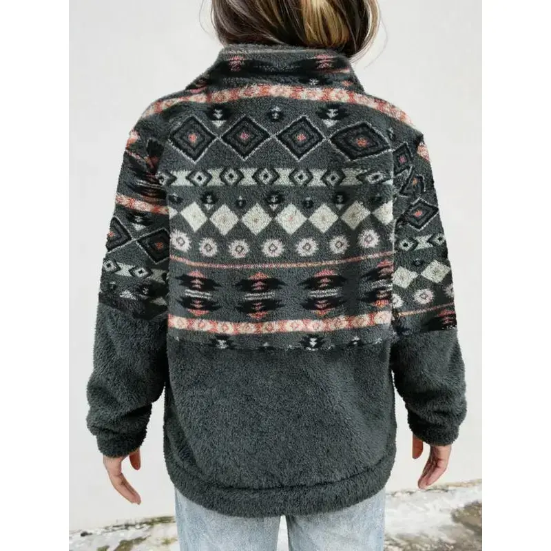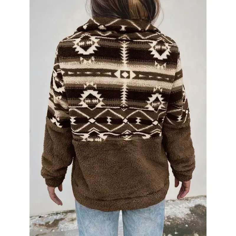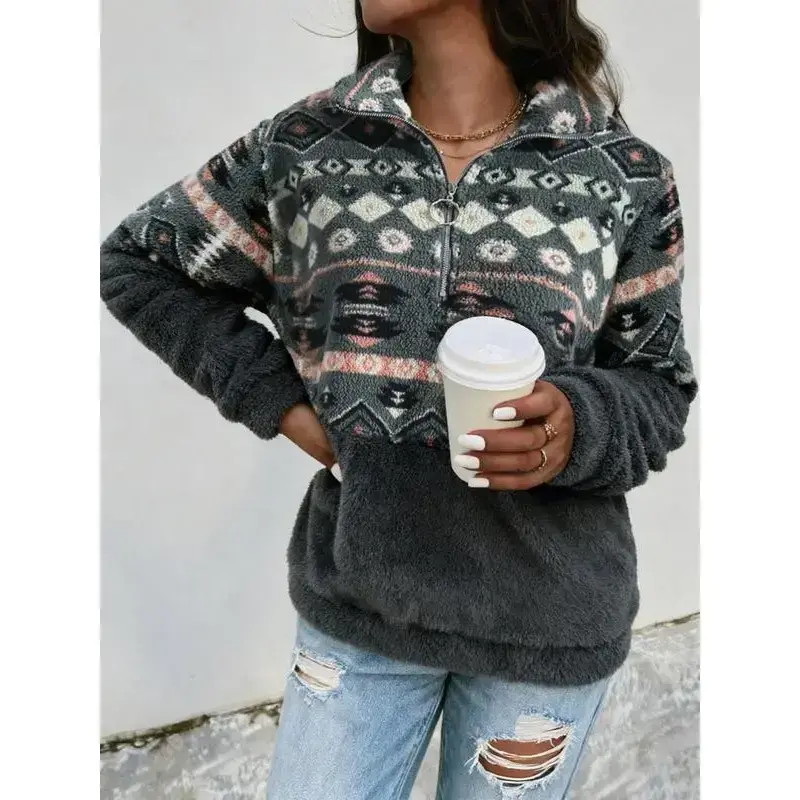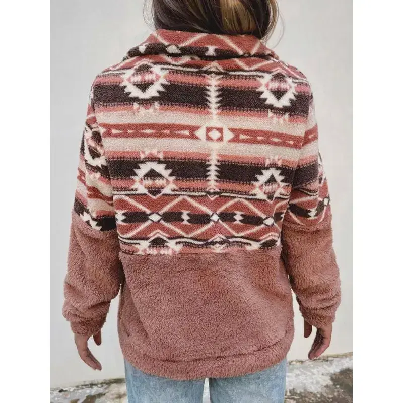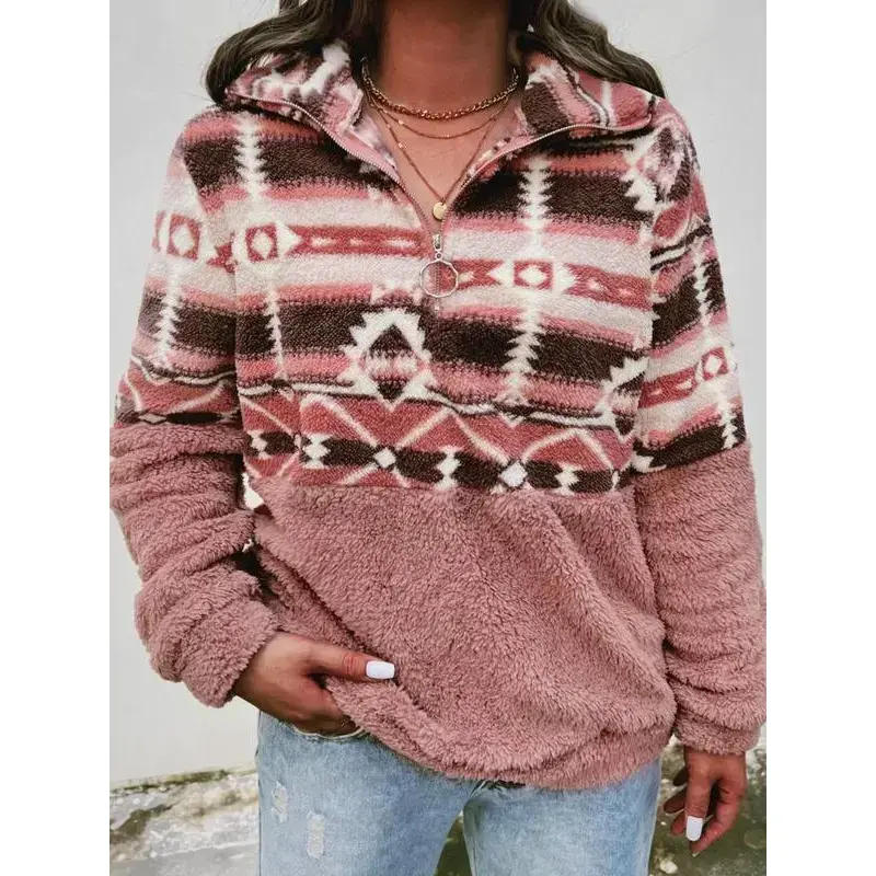 Women's Colorblock Print Drop Shoulder Zip Up Fuzzy Sweatshirt, Boho Long Sleeve Collared Polar Fleece Pullover Fall & Winter, Ladies Clothes Daily Wear