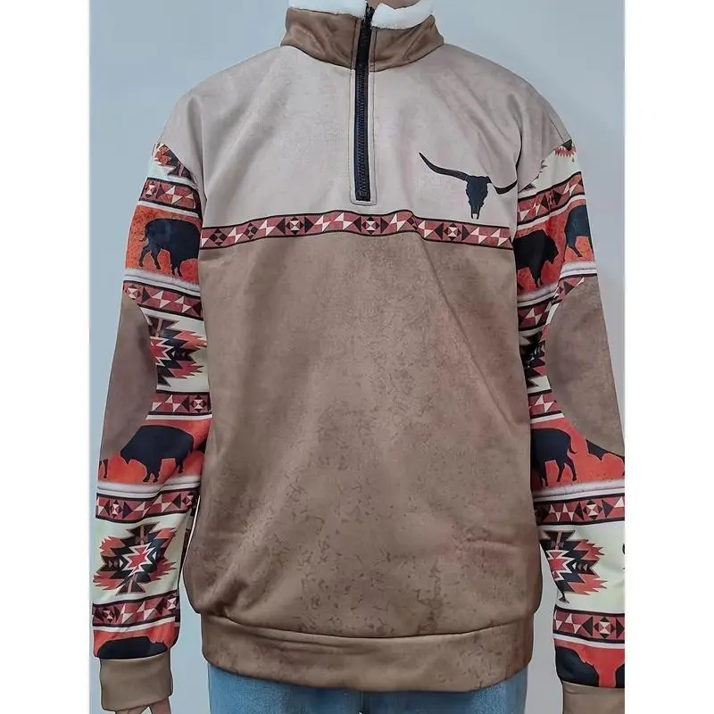 Men's Vintage Print Casual Sweatshirt ✨ Elevate your casual wardrobe with this Men's Vintage Print Casual Long Sleeve 1/4 Zip Cowboy Sweatshirt. Perfect for Winter and Fall, this Western Aztec Fleece Pullover combines style with comfort. The skinny fit and lapel collar add a touch of vintage charm. 🌟 Material and Design
