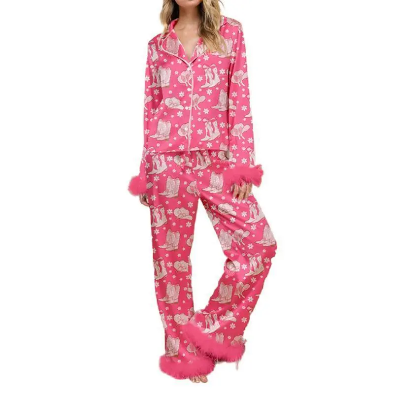 Women Christmas Pajamas Lounge Set Santa/Christmas Tree/Boots Print Shirts Tops and Pants Satin Loose 2 Piece Loungewear Outfits??gift?? Long Sleeve Nightwear