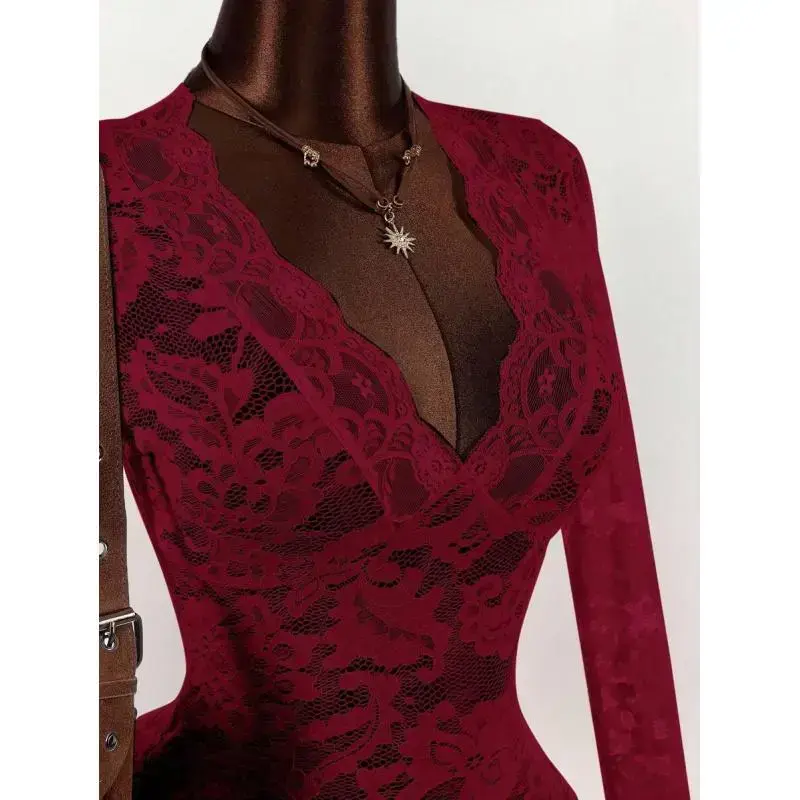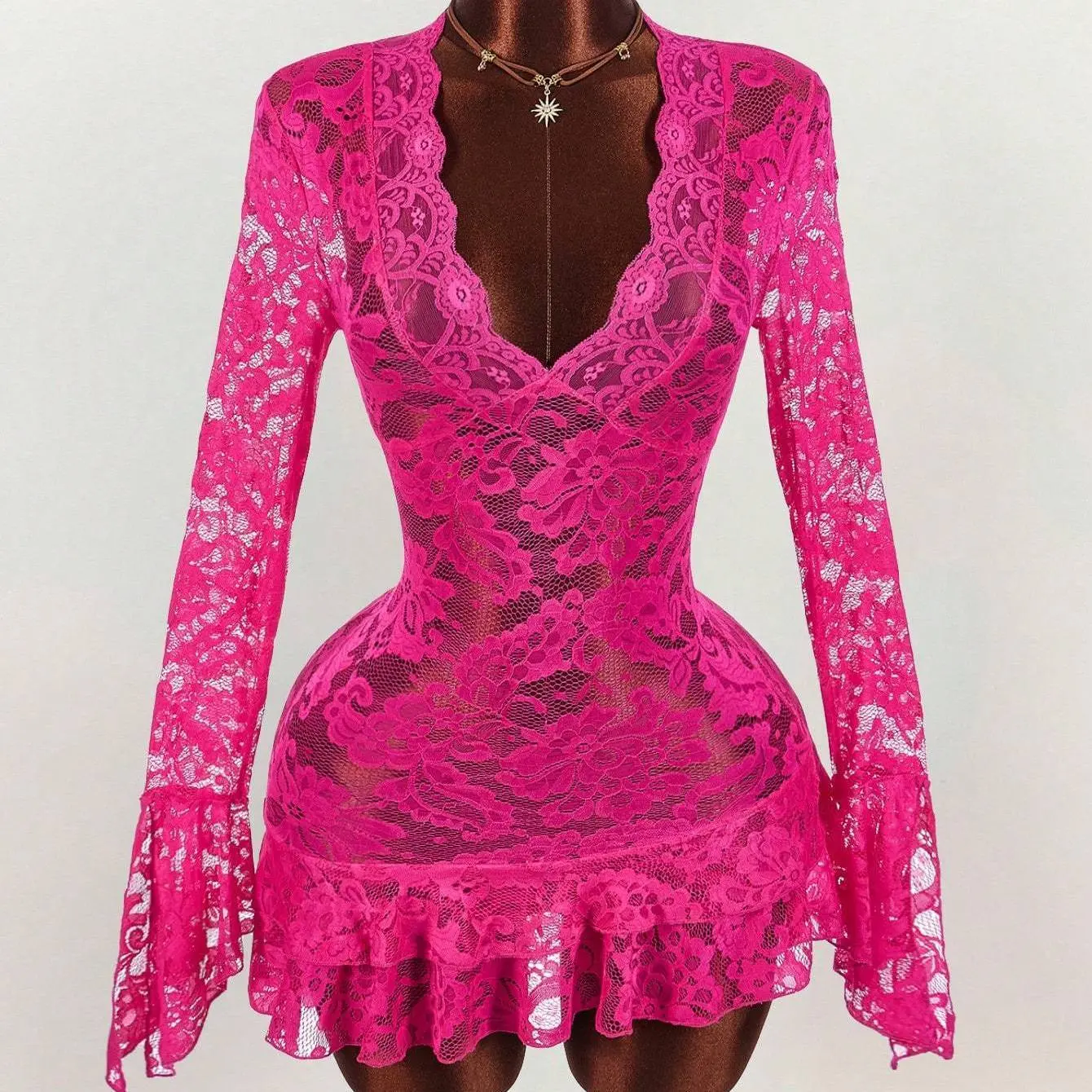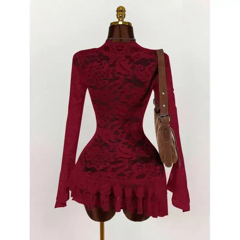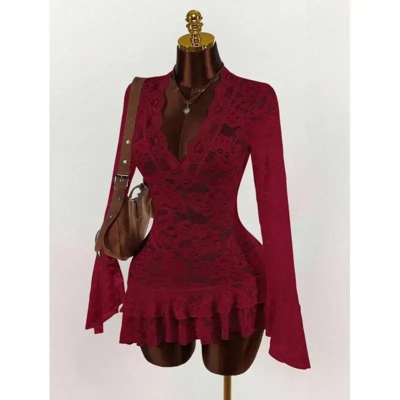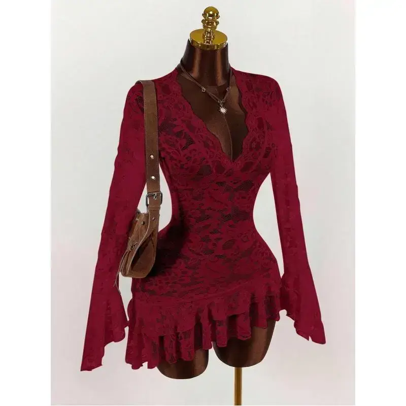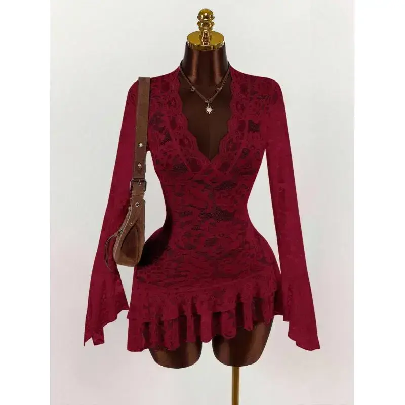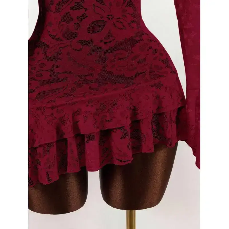 Neckline:Deep V Neck Occasion:Stage & Concert Sleeve Type:Flare Sleeve Hem Shaped:Flounce Waist Line:Natural(Mid Waist) Festivals:Ramadan, Id al-Adha, Eid al-Fitr Type:Bodycon Details:Knot, Ruffle Hem, Sheer Lined For Added Warmth:No Pattern Type:All Over Print Style:Elegant Body:No Color:Burgundy Sleeve length: extra-long sleeve Fit Type:Slim Fit Length:Mini Material:Lace Composition:90% Polyamide, 10% Elastane Care Instructions:Hand wash,do not dry clean Sheer:Semi-Sheer Fabric Elasticity:High Stretch