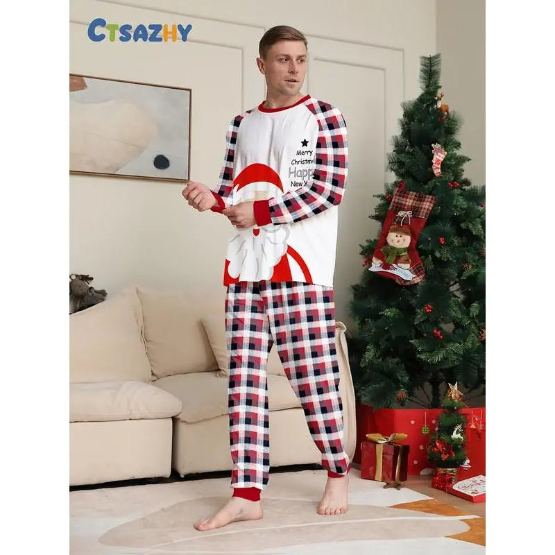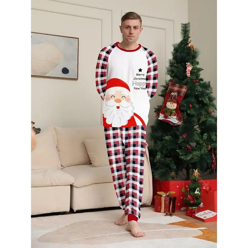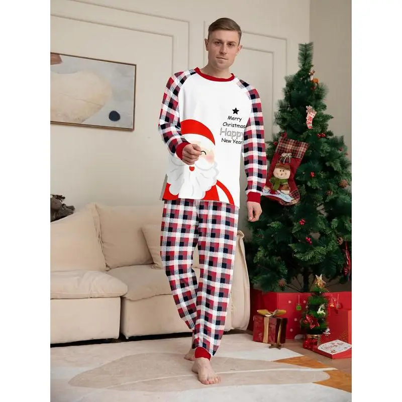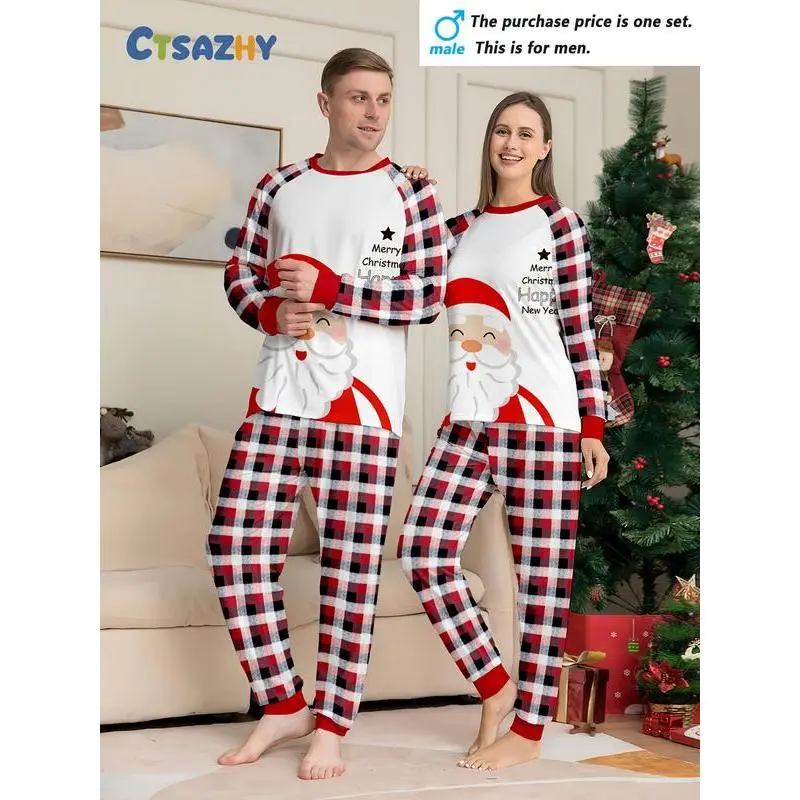 MEN/WOMEN Couple Christmas Long Sleeve Pants Loungewear Pajama Set, Santa Claus and Classic Plaid Elements, Crew Neck Design, Men's or Women's, Single Set