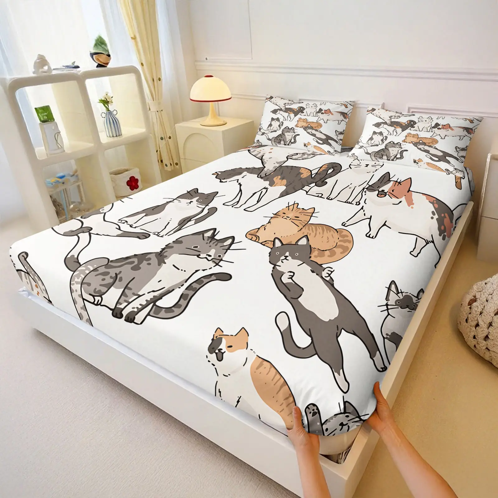 3Pcs Funny Cute Cat Digital Print Fitted Sheet Set, Cartoon Kitten Themed Bed Sheet Set, Soft Breathable Microfiber Bedding, Non-Slip All-Around Elastic, Perfect for Cat Lovers Bedroom, Guest Room, Dorm, Year-Round Use - No Filling