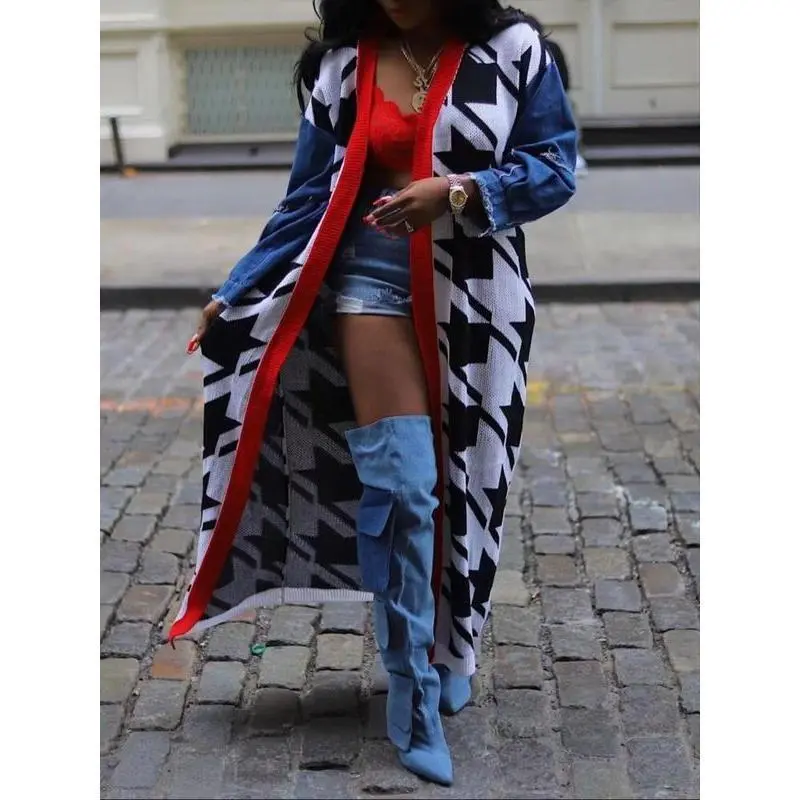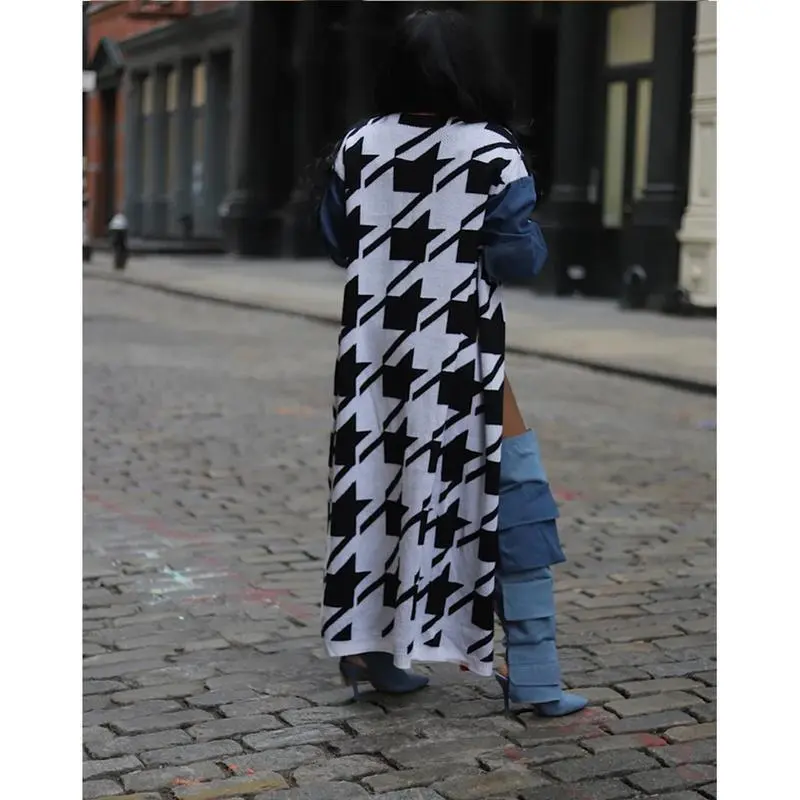 Women'sHoundstoothPatchworkPrintDropShoulderLonglineCardigan,CasualFitLongSleeveOpenFrontKnitwearforFall&Winter,FashionLadies'KnitClothingforDailyWear,SweatersforWomenCanbepairedwithwomen'swindbreakersandraincoats