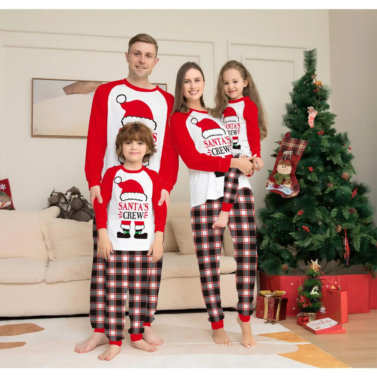 【Festive Print】: The bright Christmas-themed print adds a joyful atmosphere, setting the mood for holiday celebrations and gatherings. 【Family Coordination】: Available in matching sizes, this set enhances family bonding by allowing everyone to coordinate their holiday looks together. 【Soft Fabric】: Crafted from soft knit fabric, it offers a gentle touch against the skin, ensuring a relaxing experience while lounging at home. 【Long Sleeve Comfort】: The long sleeve design provides warmth during fall and winter, making it an excellent choice for cozy nights in. 【Moderate Thickness】: With a moderate fabric thickness, it strikes the right balance between warmth and breathability, suitable for varying indoor temperatures.