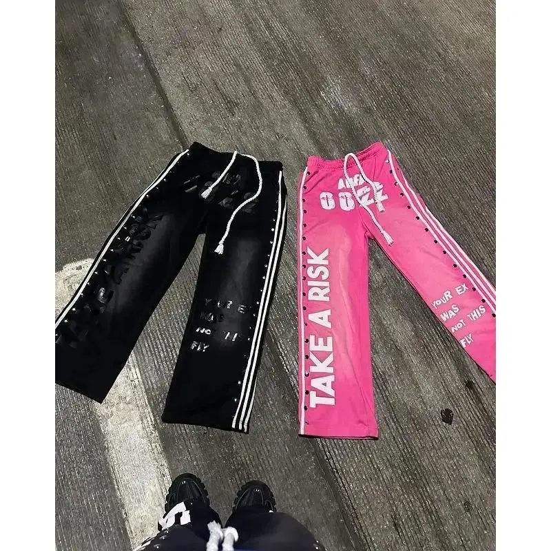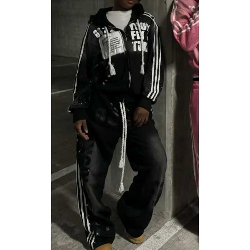[Vibrant Color Options]: Available in striking pink and classic black, these two - piece sets make a bold fashion statement.The bright pink exudes energy and confidence, while the black offers a sleek, edgy look. [Eye - catching Print Design]: Featuring large, bold letter prints all over the hoodie and sweatpants, the design screams hip - hop rock style.The patches and prints add a punk - inspired, street - savvy vibe, making each piece a standout item. [Comfortable Loose Fit]: Both the hoodie and sweatpants are designed with a loose fit.The hoodie has a full - zip front for easy wear, and the sweatpants come with drawstrings, ensuring a comfortable and adjustable fit for both men and women. [Versatile Streetwear]: Ideal for streetwear enthusiasts, this set can be worn for casual outings, music events, or simply to showcase your unique style. Pair with sneakers or boots to complete the hip - hop rock look.