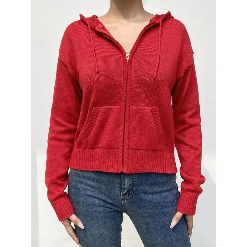 Women's Plain Drawstring Drop Shoulder Zip Up Hooded Crochet Cardigan, Casual Solid Dual Pocket Long Sleeve Outerwear, Women's ClothingGift