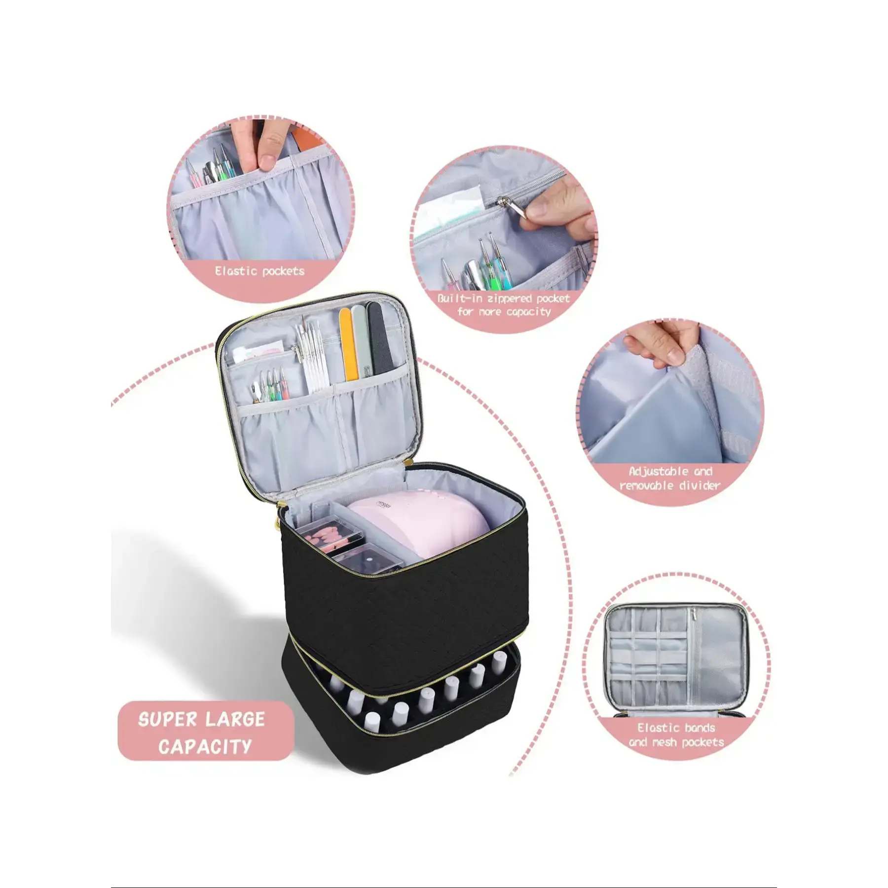 【Ample Storage】: Accommodates up to 30 bottles and light equipment, making it a spacious solution for nail polish organization. 【Travel-Friendly】: Designed for easy folding, this case is perfect for transport, supporting your nail care routine even on the go. 【Durable Materials】: Constructed with high-quality materials, ensuring that your nail tools are safely stored and protected from damage. 【User-Friendly】: Innovative layout allows for quick access to your nail products, streamlining your beauty regimen without hassle. 【Neat Appearance】: Its simple and clean design keeps your nail supplies neatly organized and visually appealing to enhance your space.