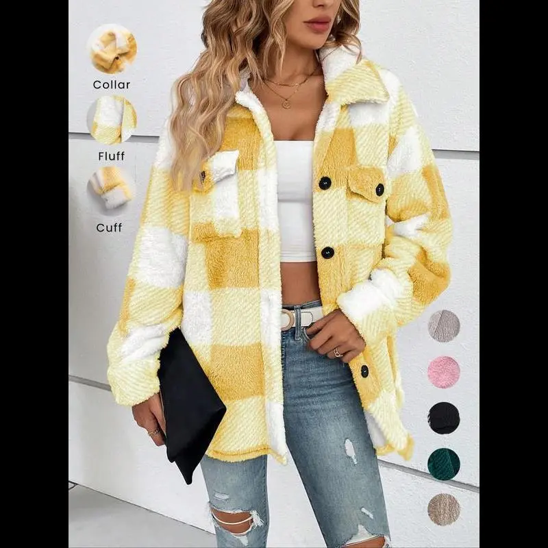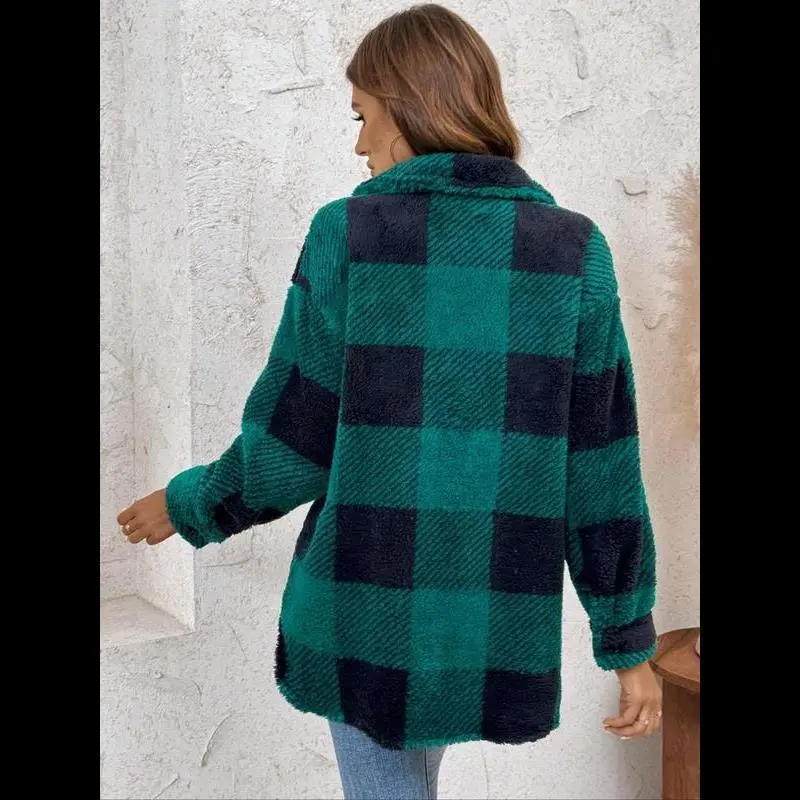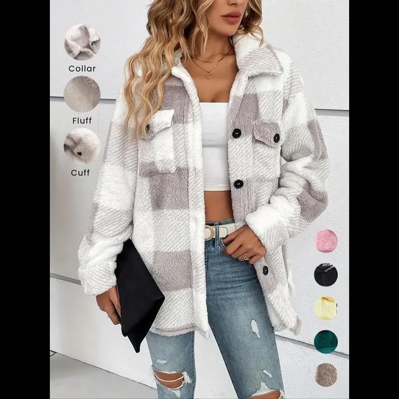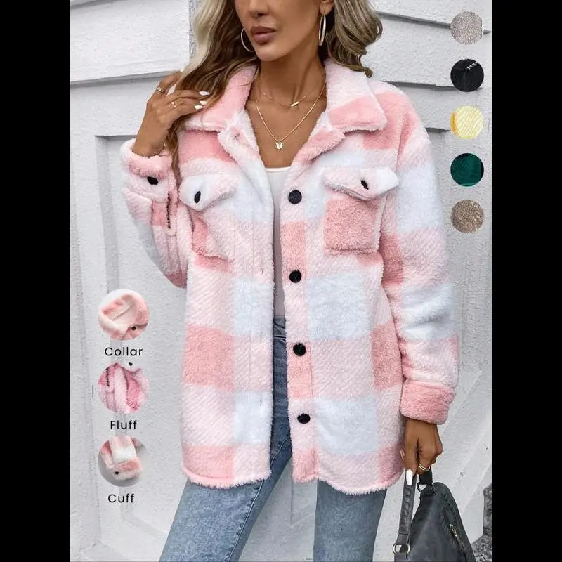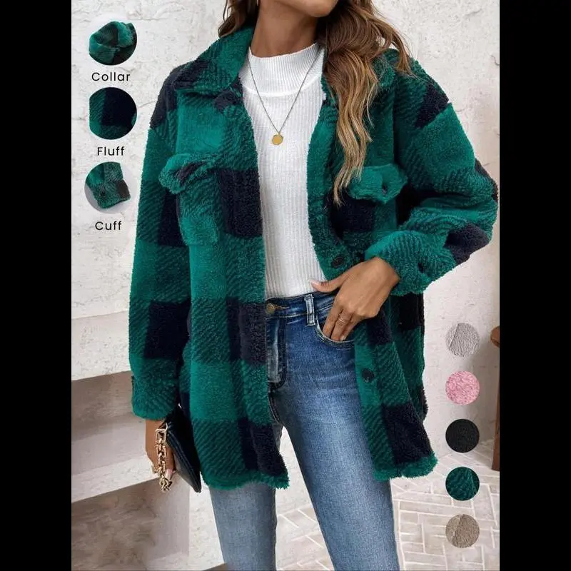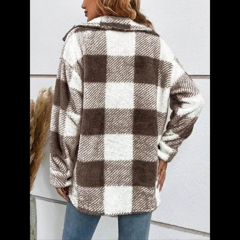 Women's Plaid Print Button Front Fuzzy Coat, Casual Drop Shoulder Long Sleeve Collared Outerwear for Fall & Winter, Ladies Clothes for Daily Wear Tops Womenswear Double Breasted Wool Coat Double-Breasted Pea Coat Open Blazer theGift