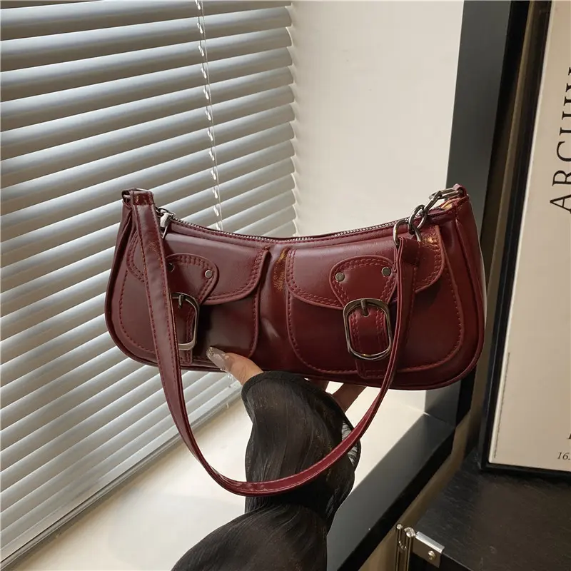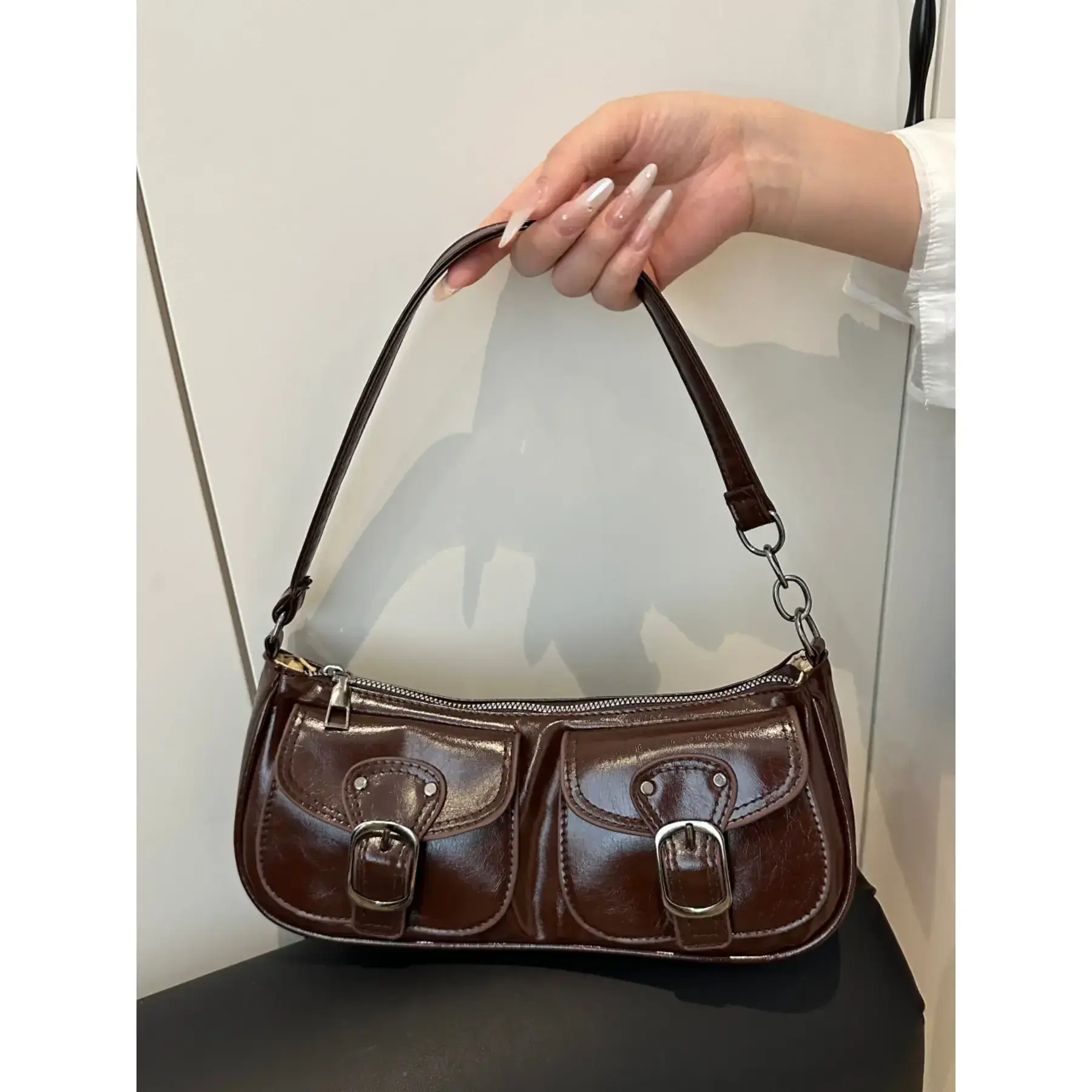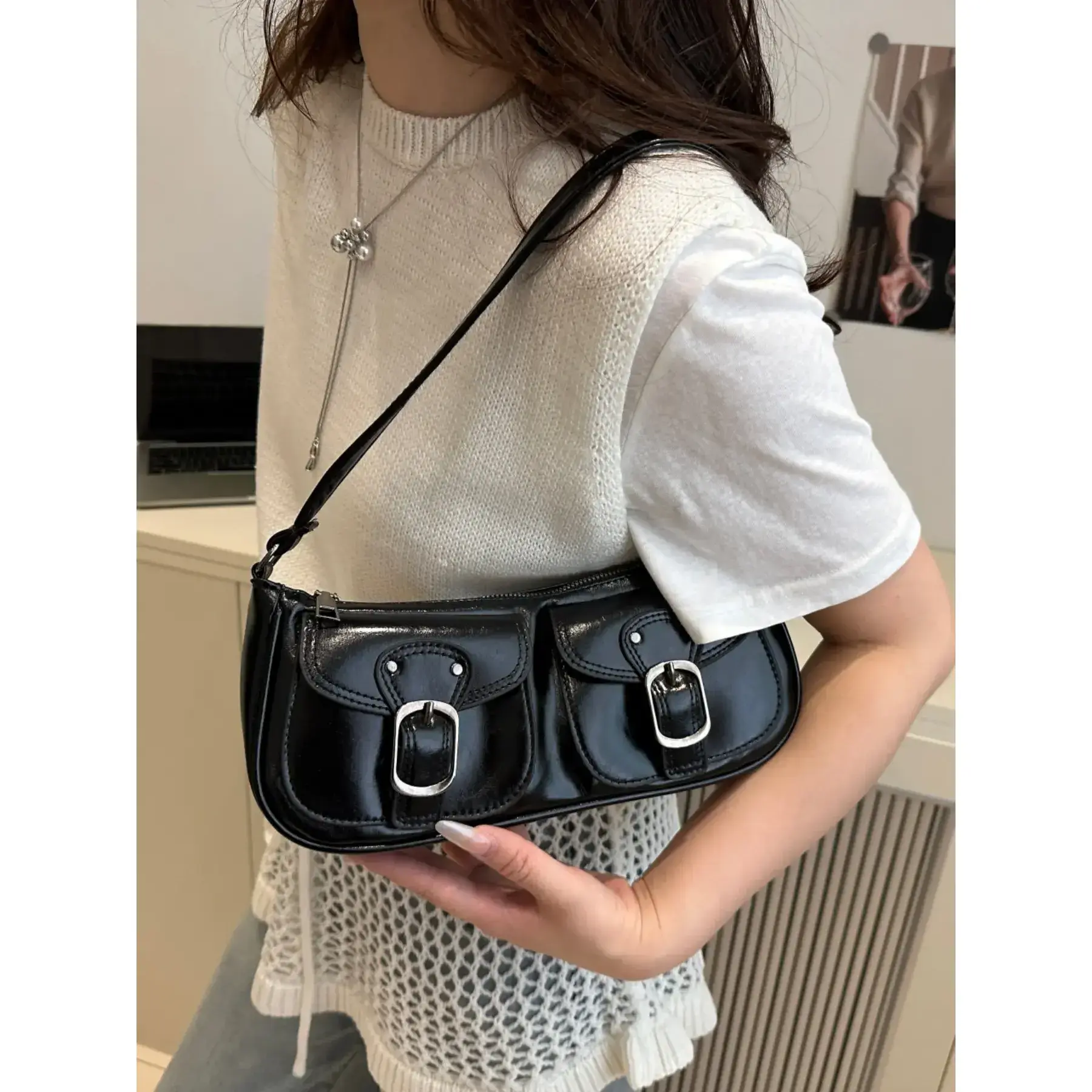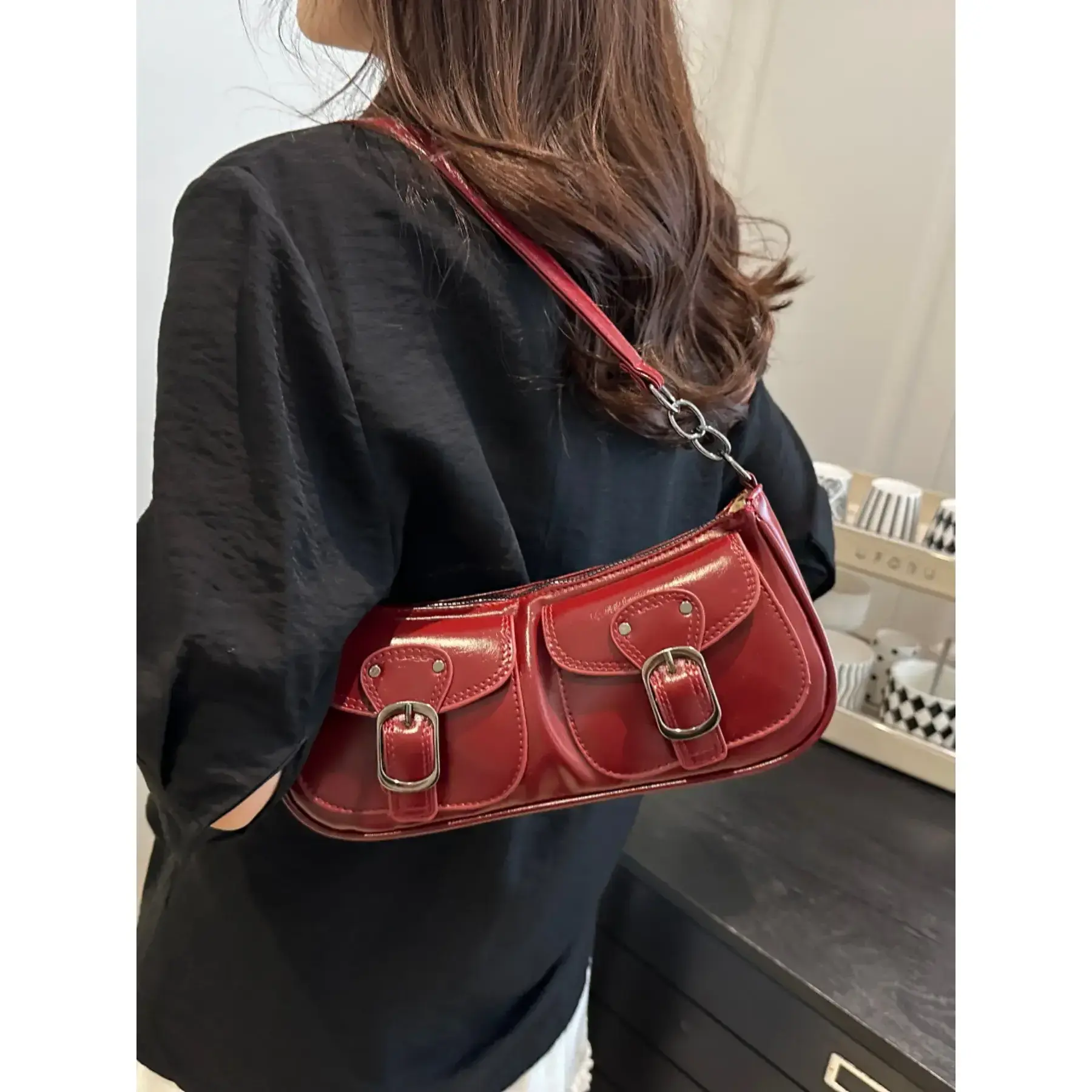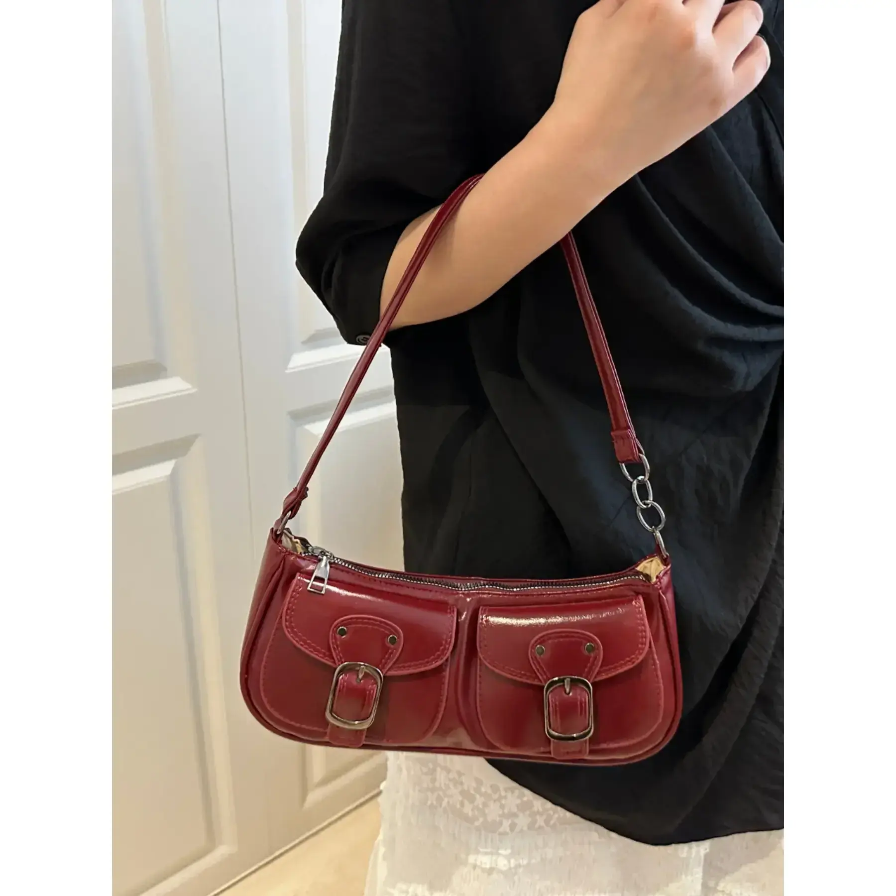 Y2K Patent Leather Baguette Bag for Women, Retro Double Buckle Pocket Shoulder Bag with Glossy Finish, Versatile for Casual Daily & Party, Multiple Color Options, Handbag Shoulder Bag