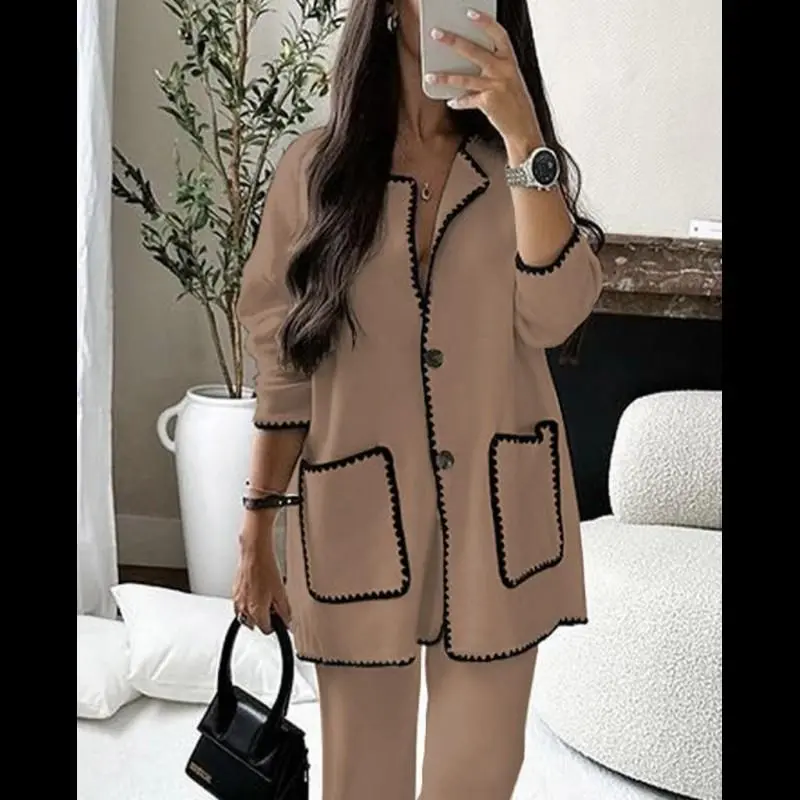 Women's Elegant Two-Piece Set with Contrast Trim Long Sleeve Cardigan and Matching Pants - Dual Pockets Loose Oversize Comfort Fit Baggy Casual Womenswear Versatile for Any Occasion Winter White Gamis Outfit Daily WearWxfe