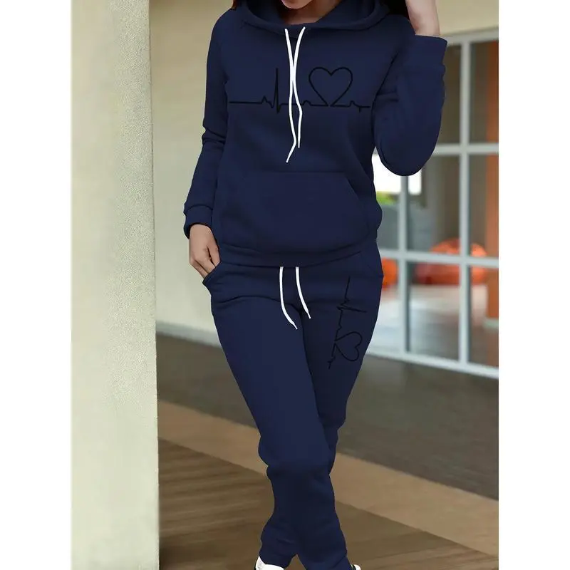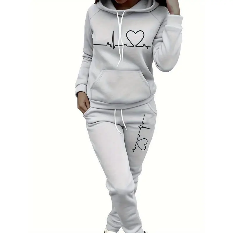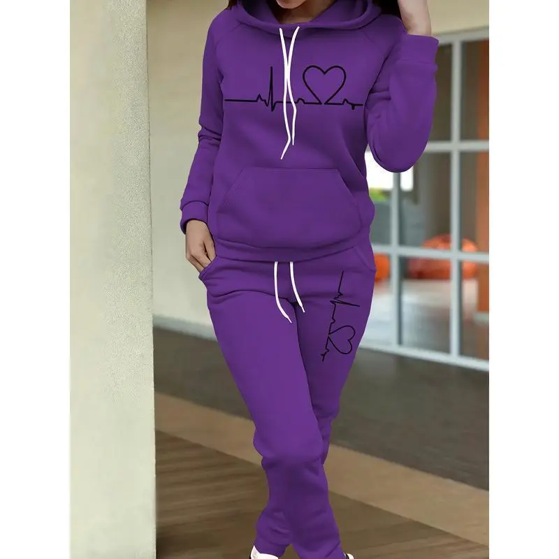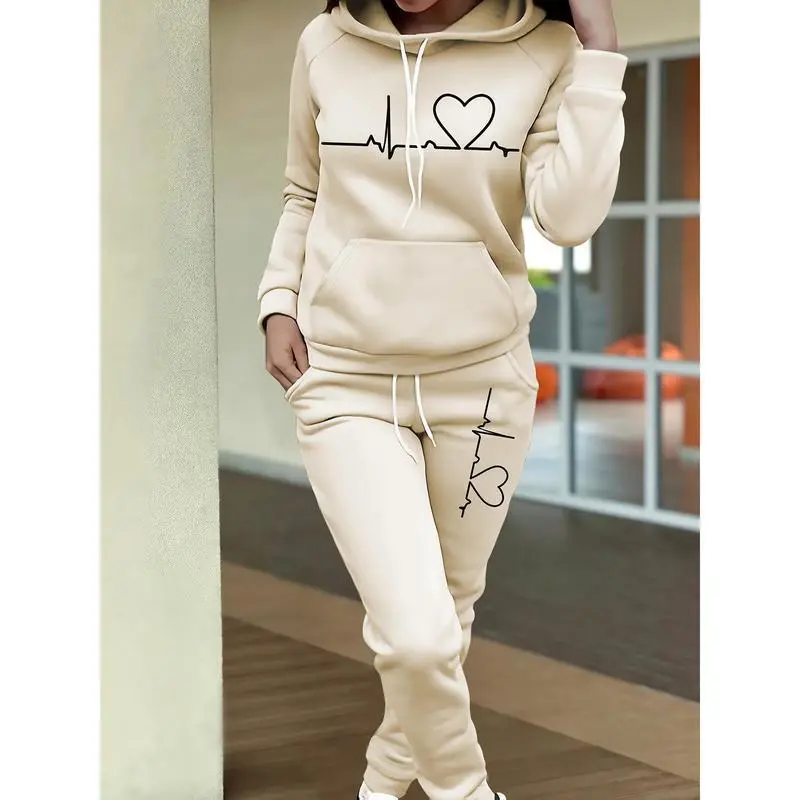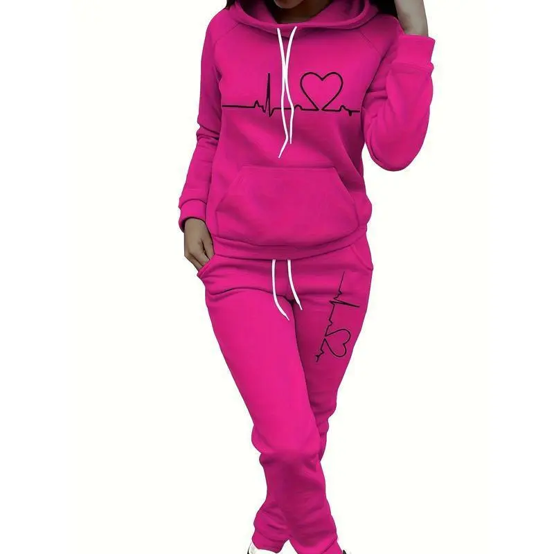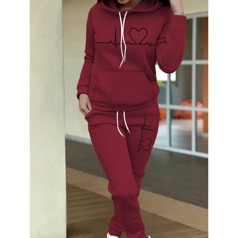 2026 New Women's Maroon Heartbeat Print Hoodie and Jogger Pants Set Autumn Winter Casual Lounge Wear with Kangaroo Pocket Minimalist Rose Red Protective Gear Suit Free $5 Gift