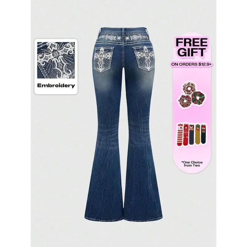 Punk retro millennium sexy pocket cross wing embroidered women's slim fit flared jeans, women's buttons, pockets, pants street wear work pants clothing fit curves blue legs can be matched with raincoat