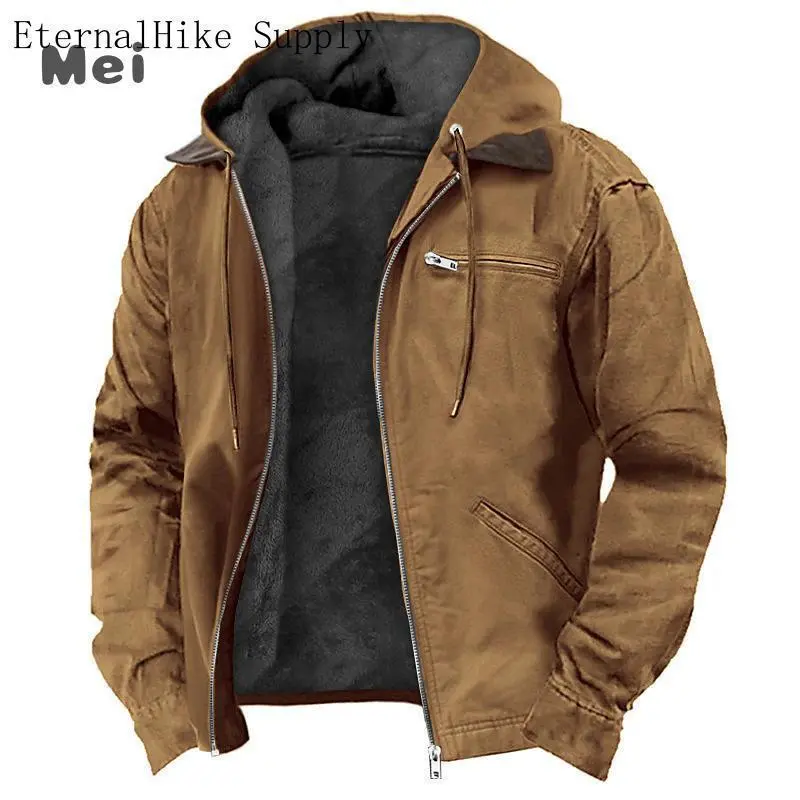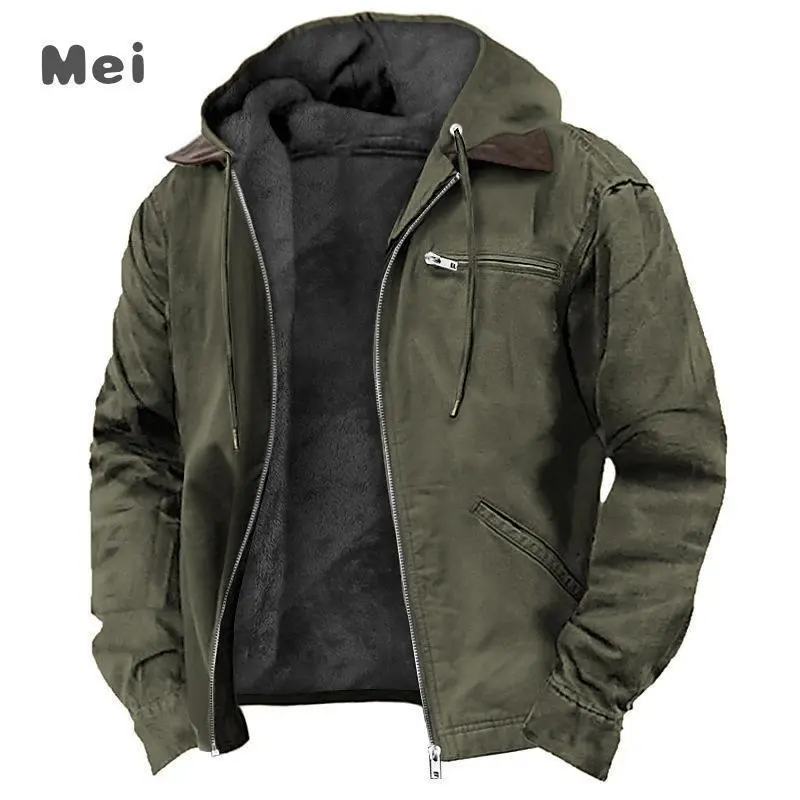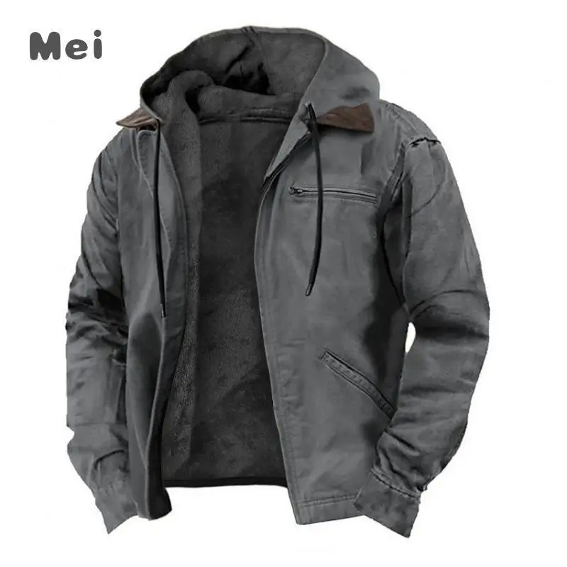 Solid Color Hooded Cotton Jacket Casual Men's Fleece Zipper Pocket Jacket Coat