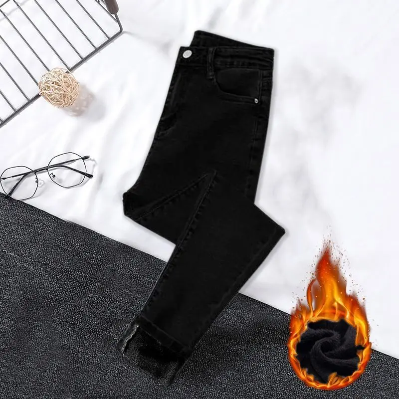 Women Thermal Jeans Winter Snow Warm Thickened Fleece Stretch Skinny Pencil Pants Fashion Korean Slim Fit Plush Pants Denim Tights with High Waist baggy embroidered heavy starched empire raw japanese semi guapi rhinestone uniqlo rise
