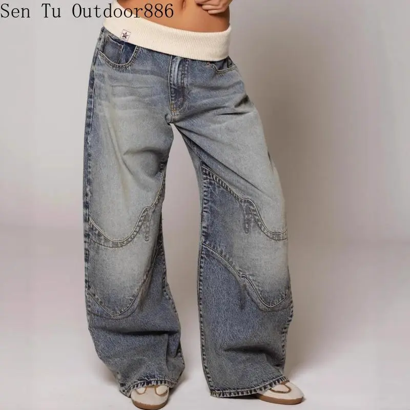 REVICEWomen'sJeansPantsFashionLooseFitCasualLowRiseDenimPantsY2KRetroStreetwearVintageAmericanWideLegTrousers
