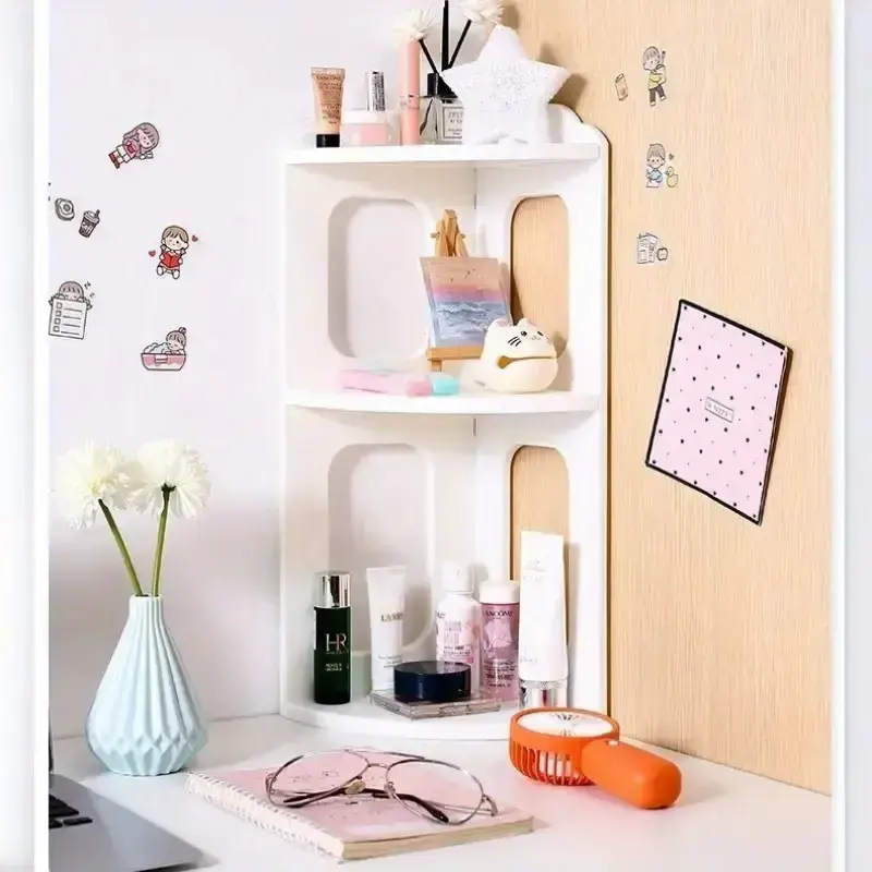 Space-Saving 3-Tier Corner Shelf, Stylish PVC Storage Rack with Round Corners, Ideal for Books, Cosmetics, Office SuppliesGift