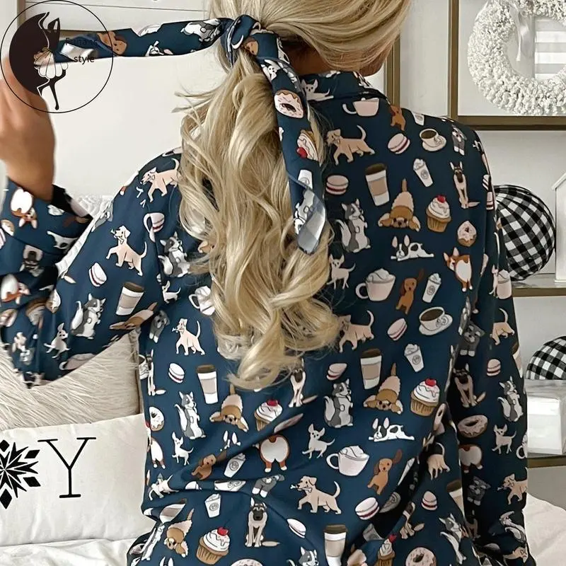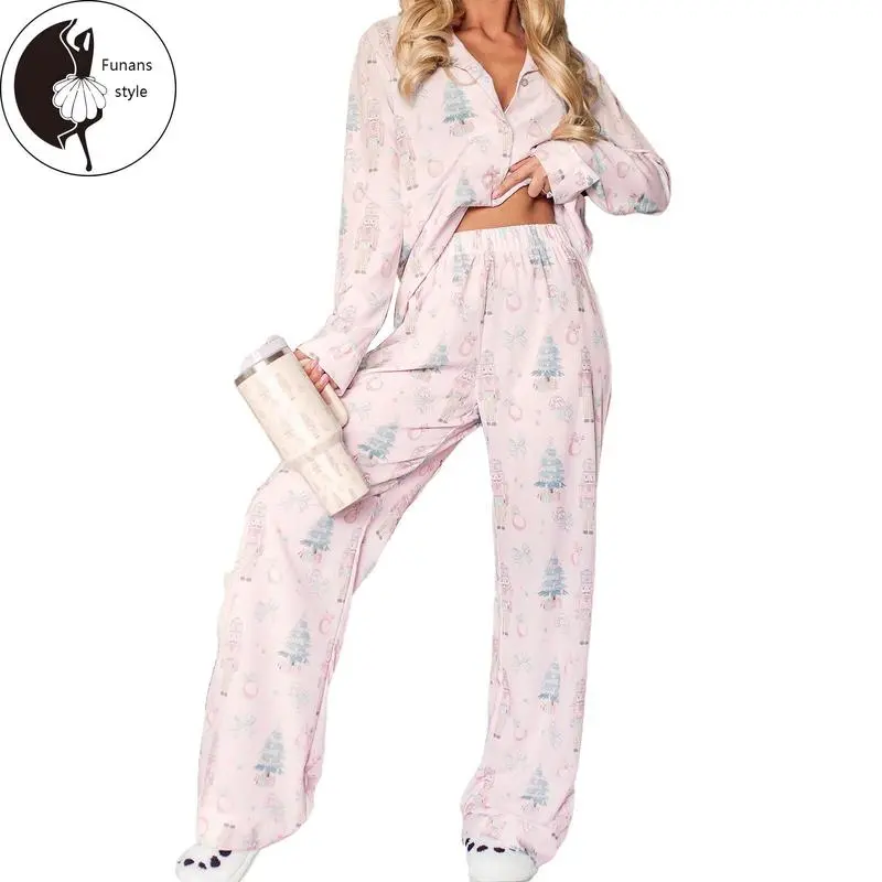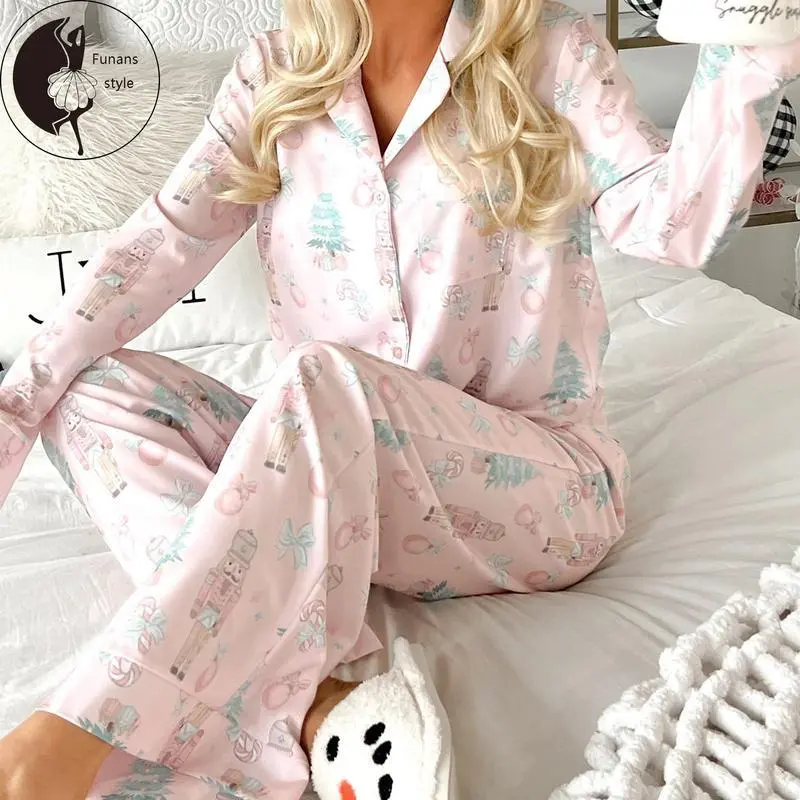 Women Christmas Pajamas Lounge Set Santa Christmas Tree Print Long Sleeve Tops and Pants 2 Piece Loungewear Outfits