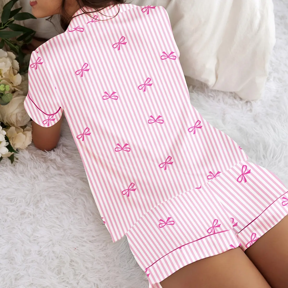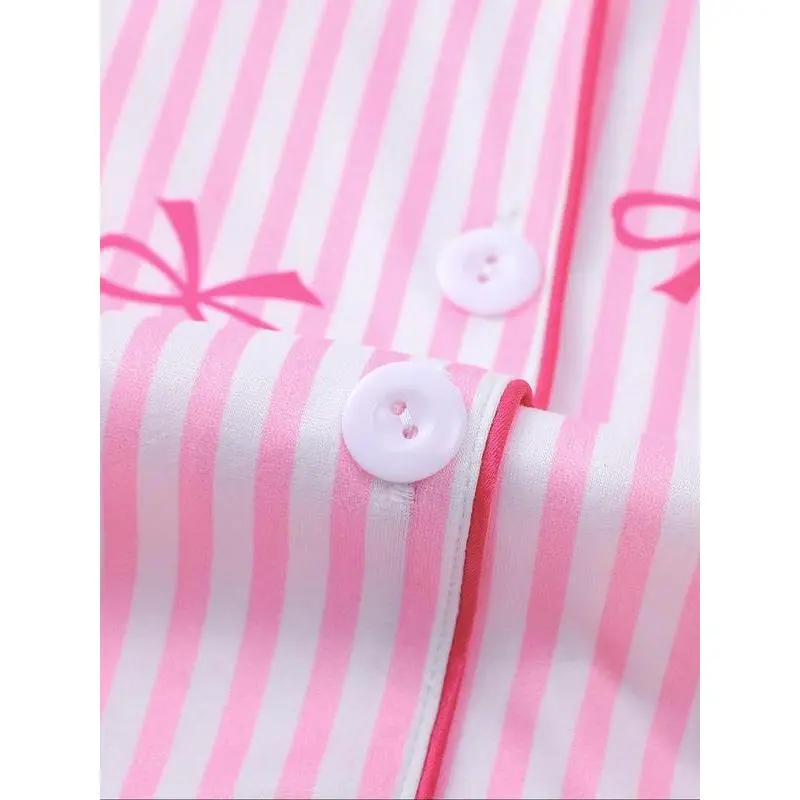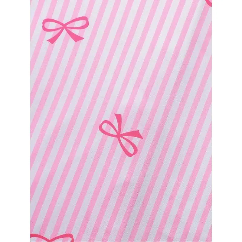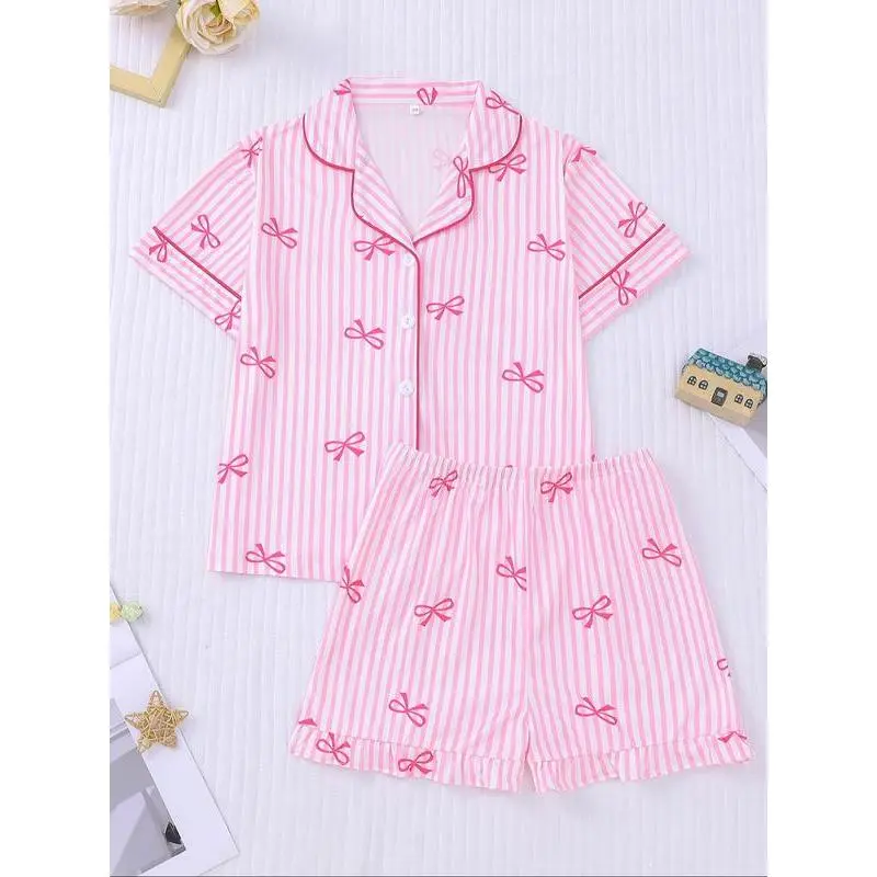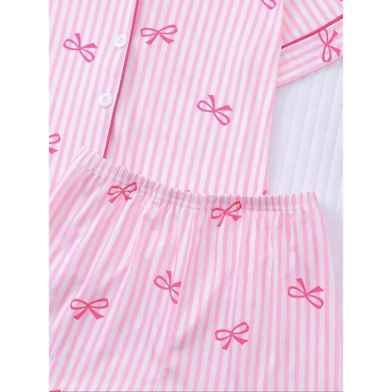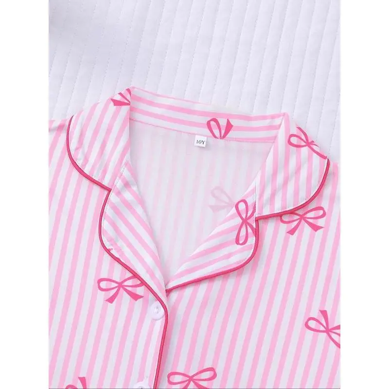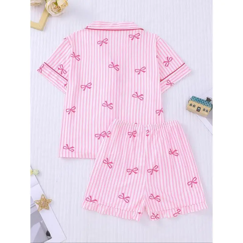 Girl's Bow Print Top & Elastic Waist Shorts Pajama Two-piece Set, Cute Comfy Short Sleeve Top & Shorts Pj Set, Kids Sleepwear for All Seasons, Casual Comfy Pyjama, Striped Summer Pajama