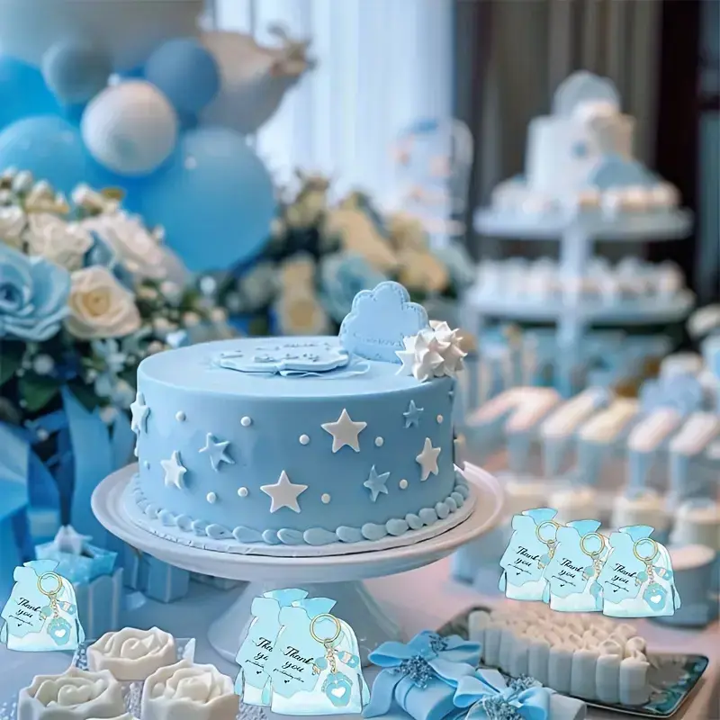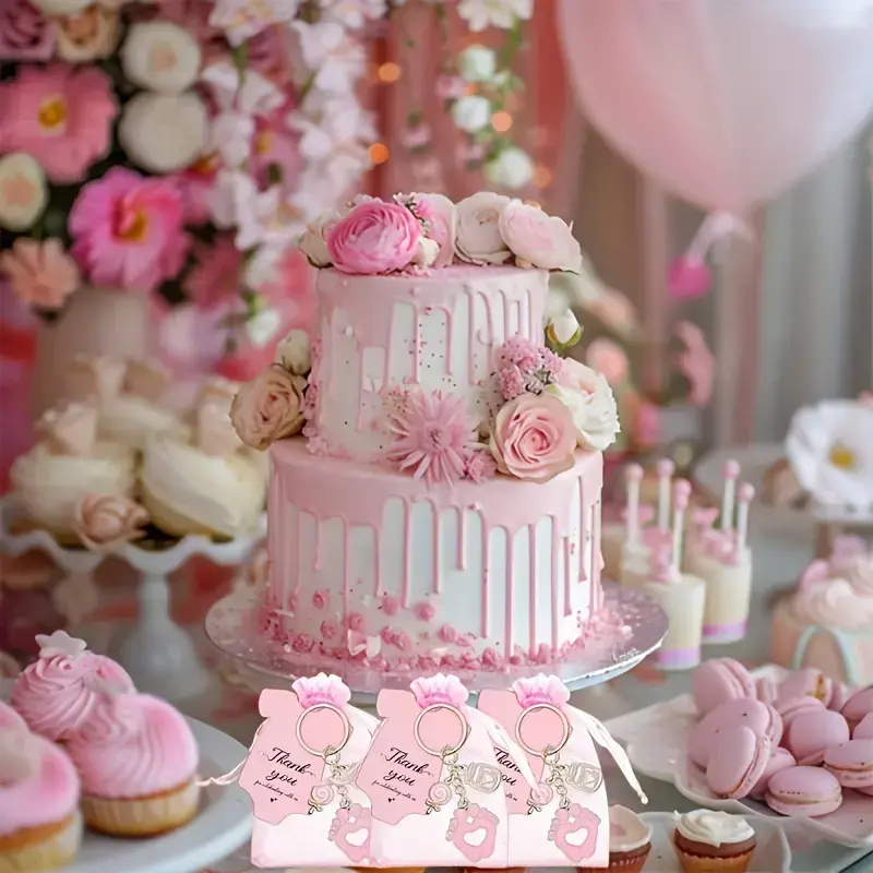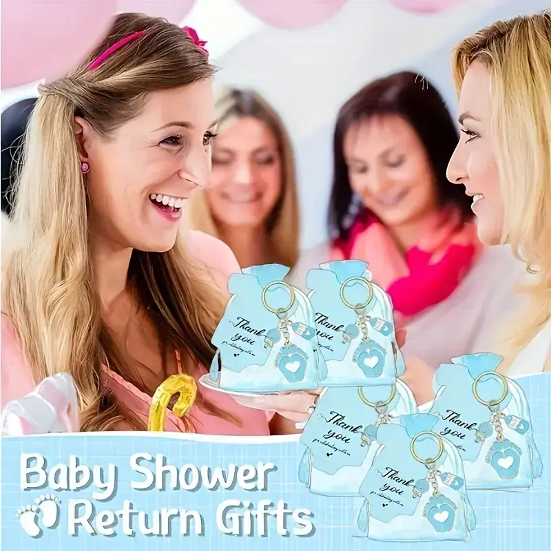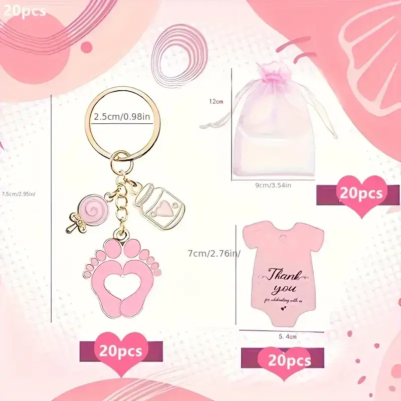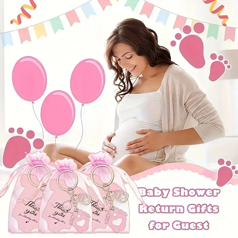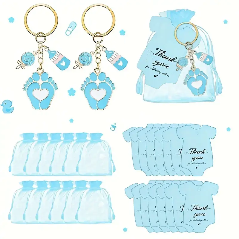 Shower Gift Souvenir Set - 60pcs Pink or Blue Footprint Keychain, Tulle Gift Bag & Thank You Tag - For Baby Shower Parties Gift for Guests