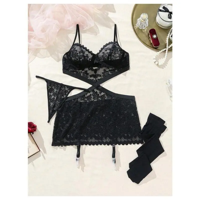 Fabric: Some stretch, lightweight and skin friendly Design: Lace, cut out, adjustable spaghetti strap, babydoll chemise, mid-rise thong, garter belt, 1 pair stocking, 4 piece lingerie set Occasion: Perfect for wedding night, honeymoon, Valentine's Day, anniversary, boudoir shoots, date nights, or every hot sweet night Garment Care: Hand wash, do not dry clean Please refer to size measurement before ordering ( The size chart is product measurement, not body measurement) Size Chart:??Product Measurement) S:Length:20.3IN,Straps Length:13.8IN,Top Length:5.7IN,Length:8.1IN,Waist Size:24.4-38.6IN M:Length:20.7IN,Straps Length:13.8IN,Top Length:6.1IN,Length:8.5IN,Waist Size:26.0-40.2IN L:Length:21.1IN,Straps Length:13.8IN,Top Length:6.5IN,Length:8.9IN,Waist Size:27.6-41.7IN XL:Length:21.5IN,Straps Length:13.8IN,Top Length:6.9IN,Length:9.3IN,Waist Size:29.1-43.3IN