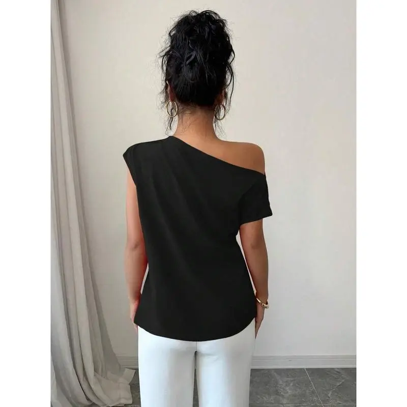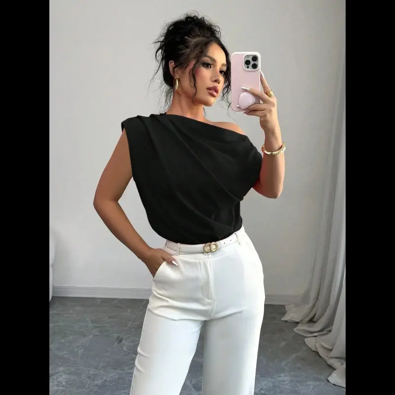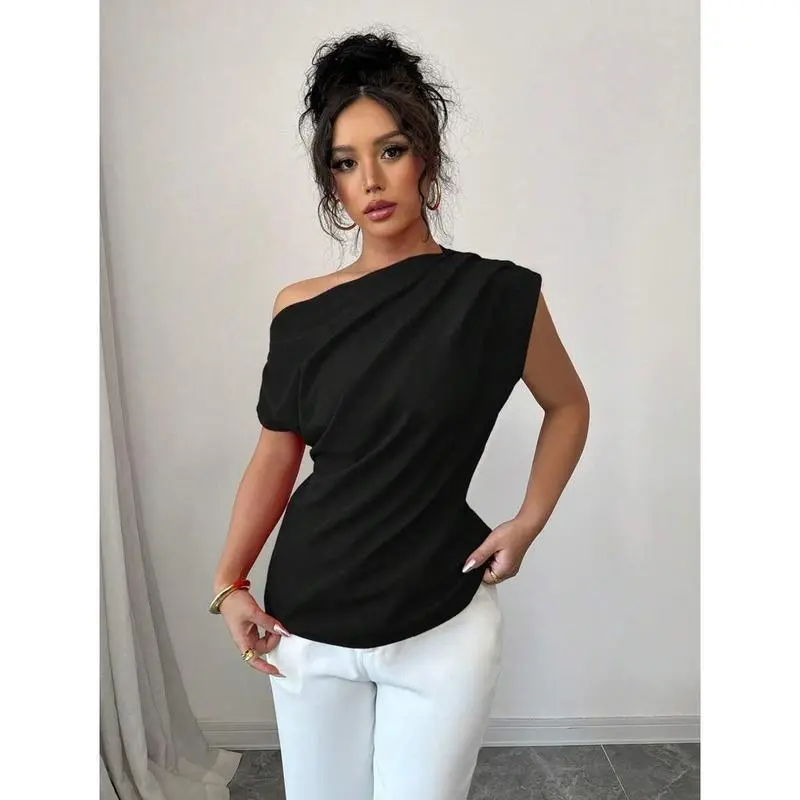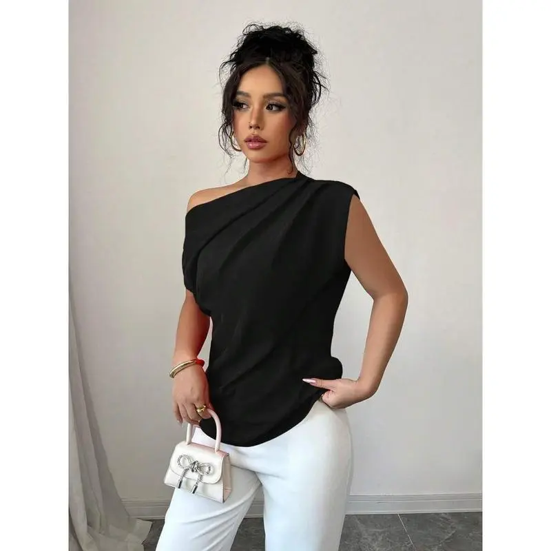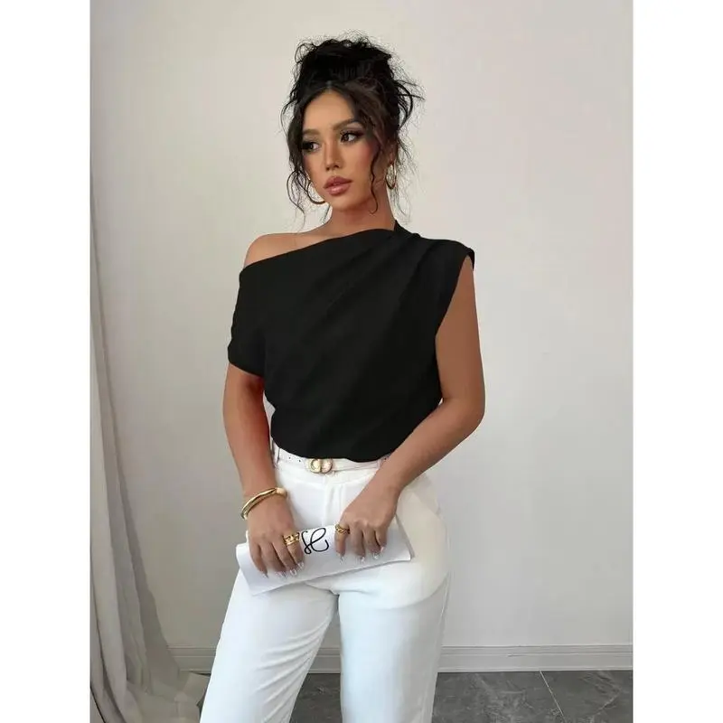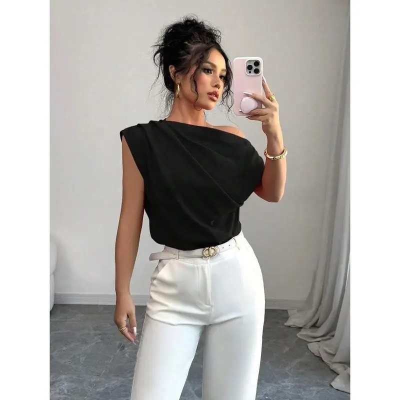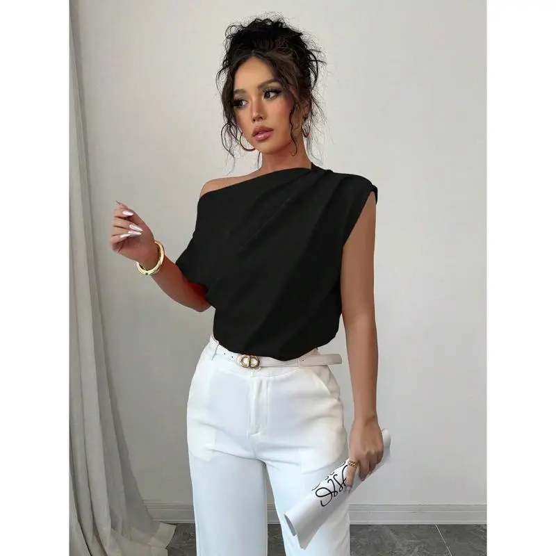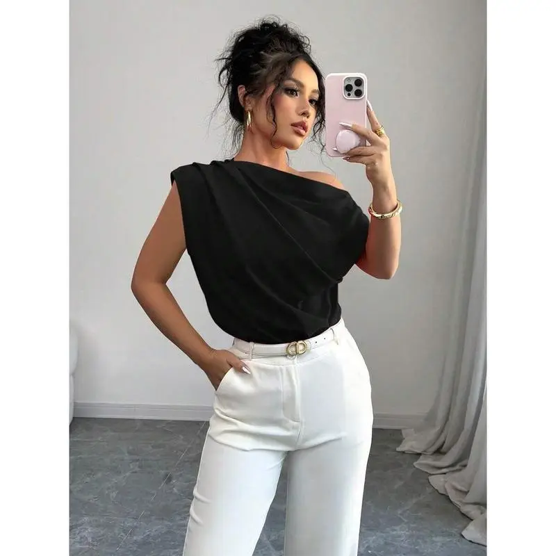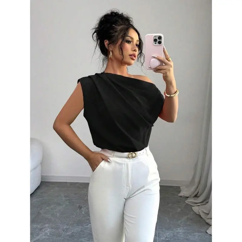 WomenElegantCommuterSolidColorRuffleShoulderBlouse
