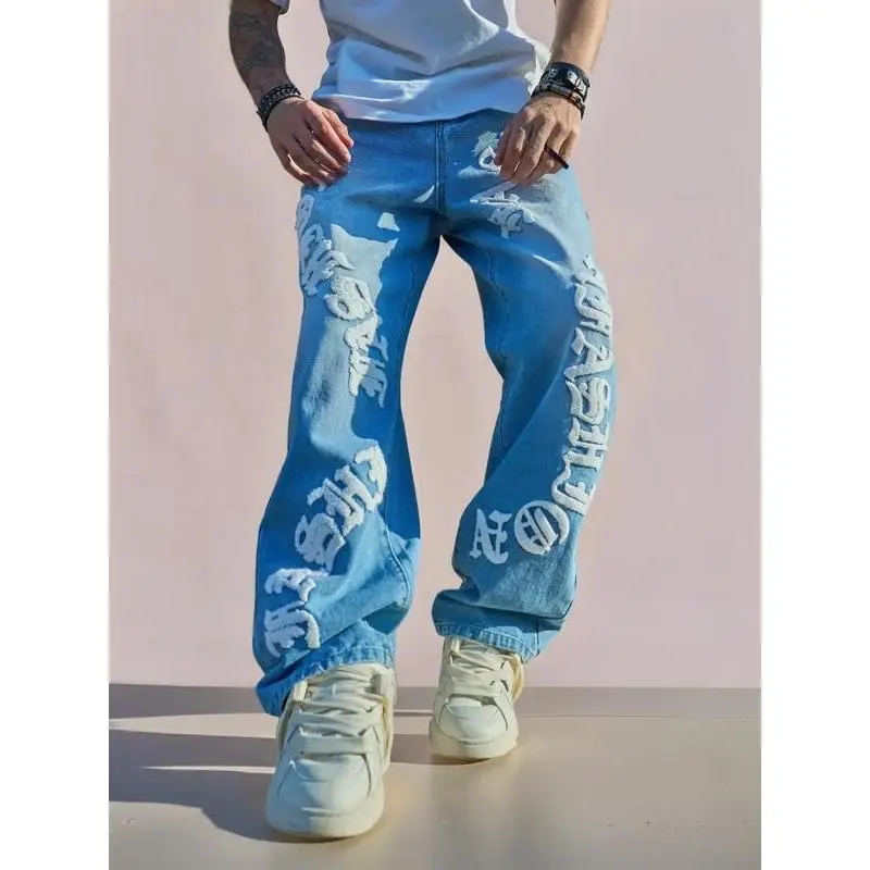 Men's Letter Print Denim Jeans, Loose Casual Straight Leg Jeans for Daily Wear, Jeans for Men, Men's Trousers for All Seasons, Jeans for Men, Cotton, Relaxed Jeans, Streetwear, Medium Wash