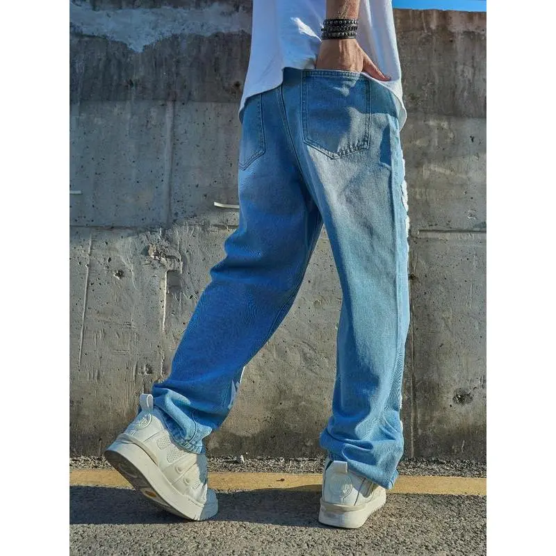 Men's Letter Print Denim Jeans, Loose Casual Straight Leg Jeans for Daily Wear, Jeans for Men, Men's Trousers for All Seasons, Jeans for Men, Cotton, Relaxed Jeans, Streetwear, Medium WashGift