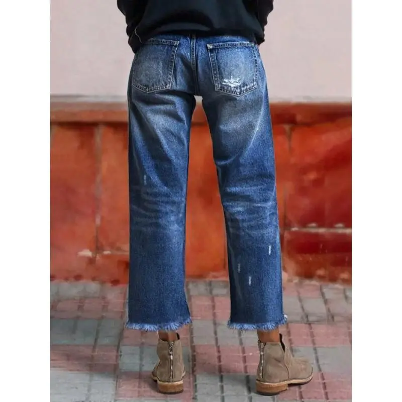 [Relaxed fit]: The loose-fitting cut allows for freedom of movement during everyday activities and outings. [Distressed details]: Featuring a washed and frayed edge look, these jeans offer a contemporary casual vibe that stands out. [Seasonal versatility]: Designed for all seasons, these denim shorts are adaptable for any weather, ensuring wearability year-round. [Moderate fabric thickness]: Crafted from medium-weight denim, these pants provide durability without sacrificing breathability for year-round use. [Straight leg cut]: The straight leg design delivers a classic silhouette, making them suitable for various occasions and outfits.