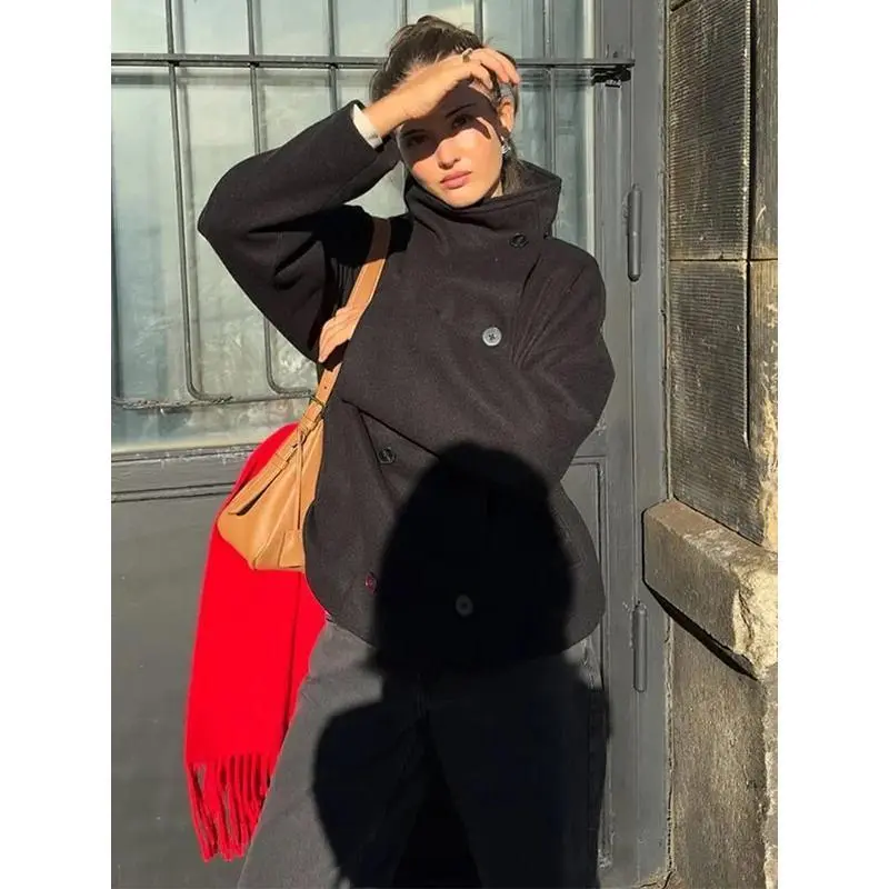 Solid Turtleneck Double-Breasted Pocket Coats Women Casual Loose Full Sleeve Female Jacket 2025 Autumn Office Lady Jackets