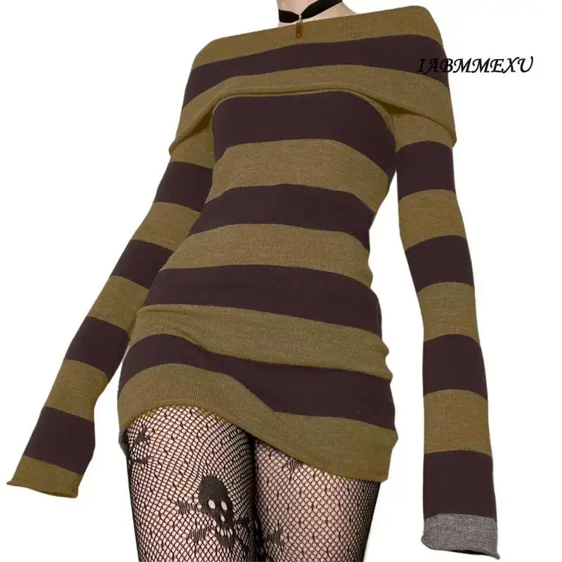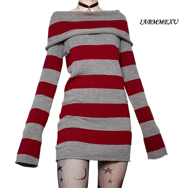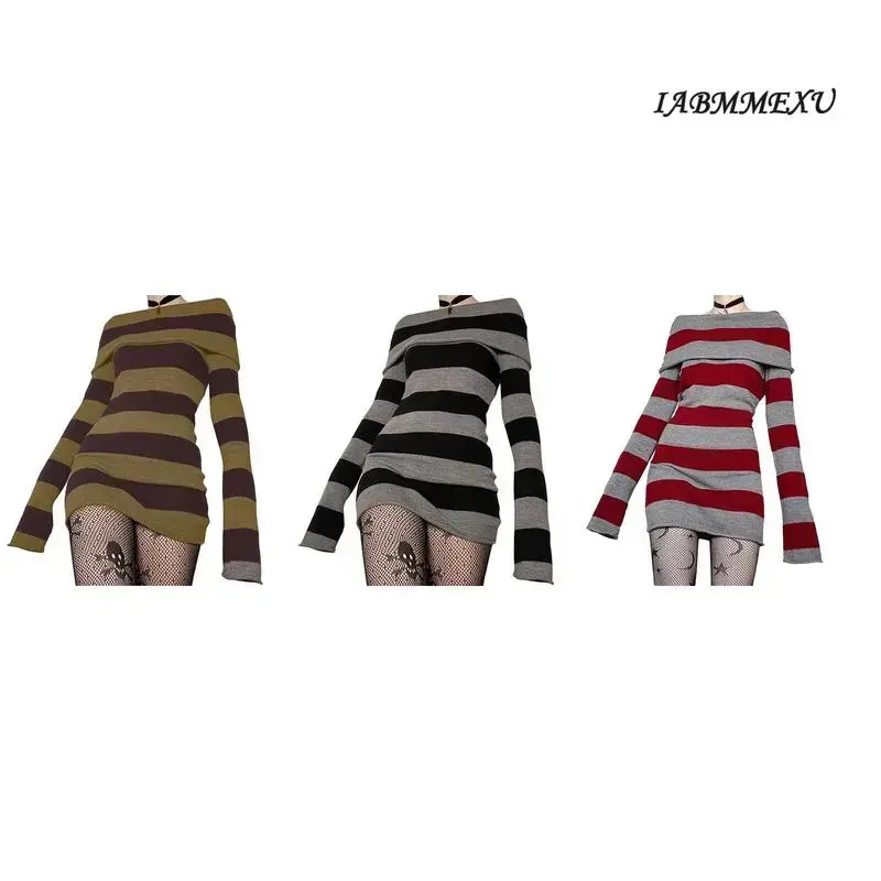 (influencer-approved) Women Gothic Dress Punk Off Shoulder Striped Knit Dress Y2k Fairy Grunge Dress Halloween Dark Academia Clothes Casual Long Sleeve comfortable dress Summer Black Light Polyester Womenswear Boat Bodycon Check