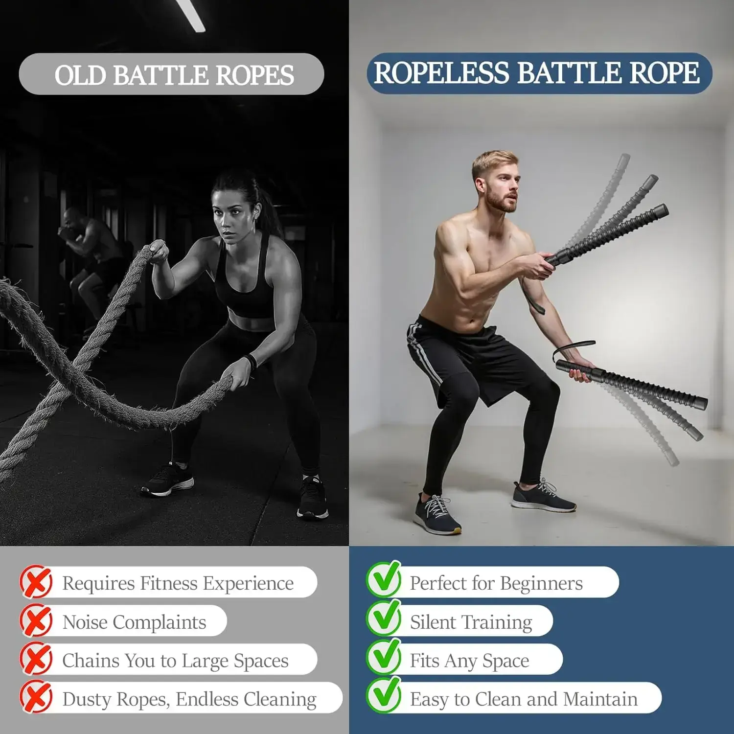 【Portable Use】: This cordless battle rope offers great portability for home workouts, allowing users to easily exercise anywhere. 【Low-Intensity Training】: Designed for low-intensity aerobic workouts, making it accessible for beginners and those focusing on endurance. 【Versatile Exercise Tool】: Use this product for HIIT workouts, providing a dynamic and engaging option for a full-body workout. 【Innovative Rope-Free Design】: The unique rope-free design eliminates tangling issues, simplifying use and enhancing workout experience. 【Home Gym Essential】: An excellent addition to any home gym setup, facilitating muscle activation and cardiovascular benefits.