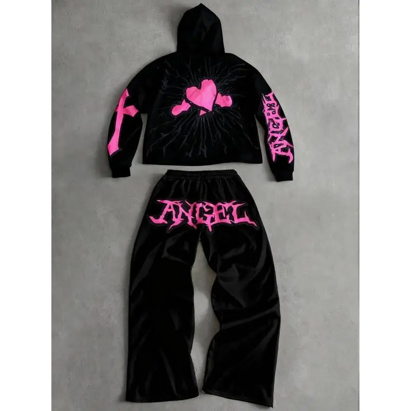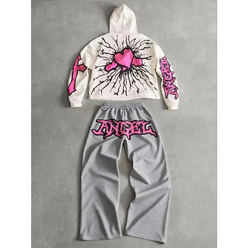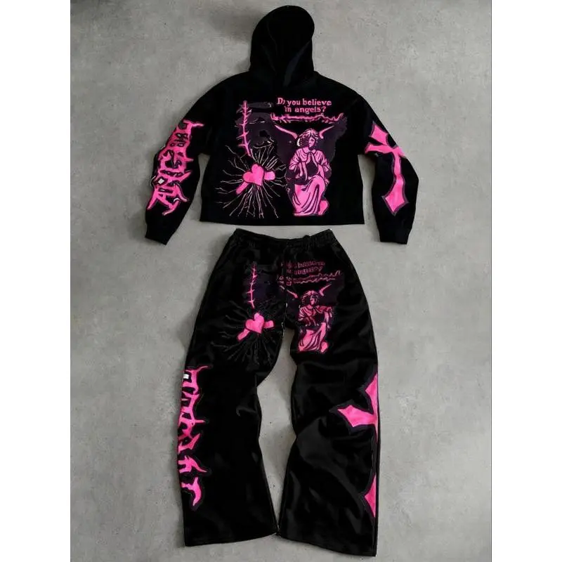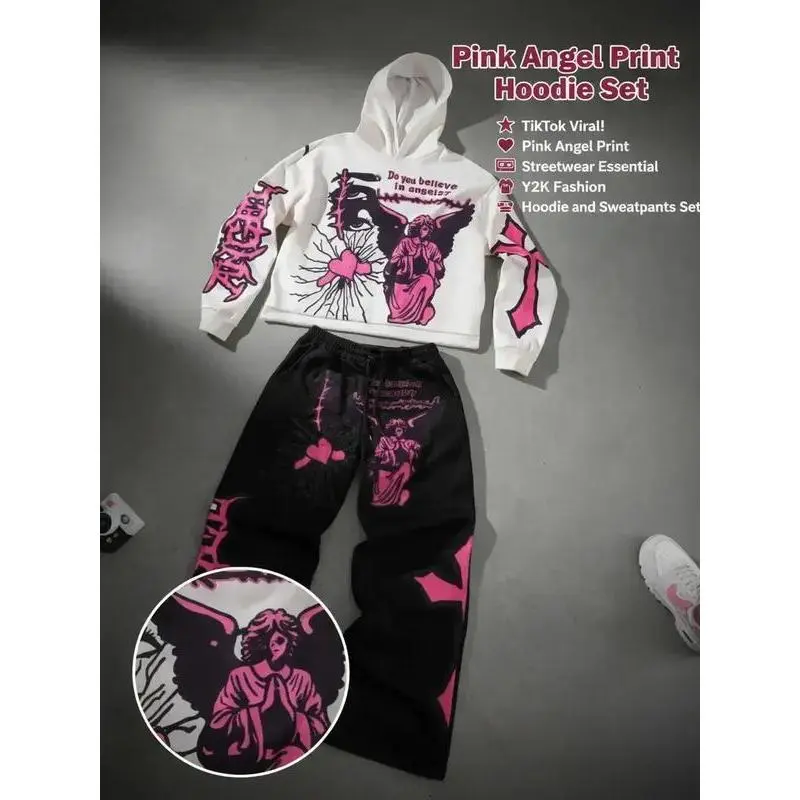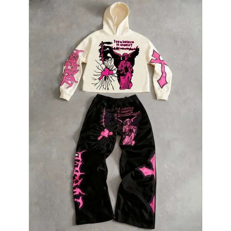 【Unique Pattern】: The all-over print features a pink angel motif, setting this set apart from typical streetwear options. 【Fitted Silhouette】: Tailored fit ensures a flattering shape, providing a sleek look while maintaining wearability for everyday outings. 【Seasonal Versatility】: Designed for fall and winter, this outfit offers warmth without sacrificing the trendy street aesthetic. 【Long Sleeve Detail】: Long sleeves add coverage and warmth, making it a practical choice for transitional weather. 【Regular Length】: Standard top length provides functional coverage, pairing well with the matching sweatpants for a cohesive look.