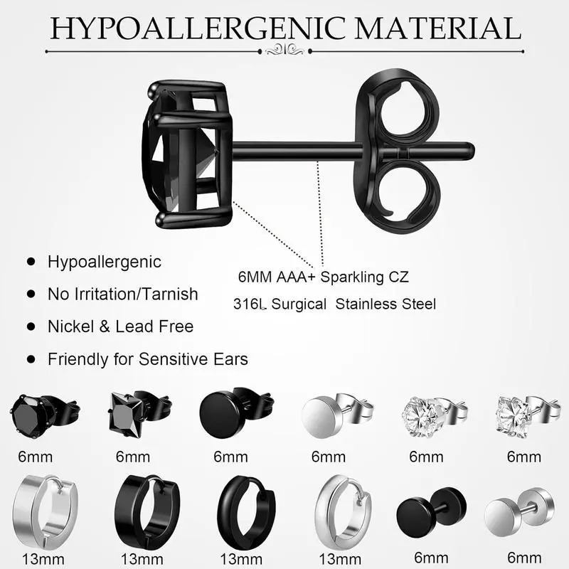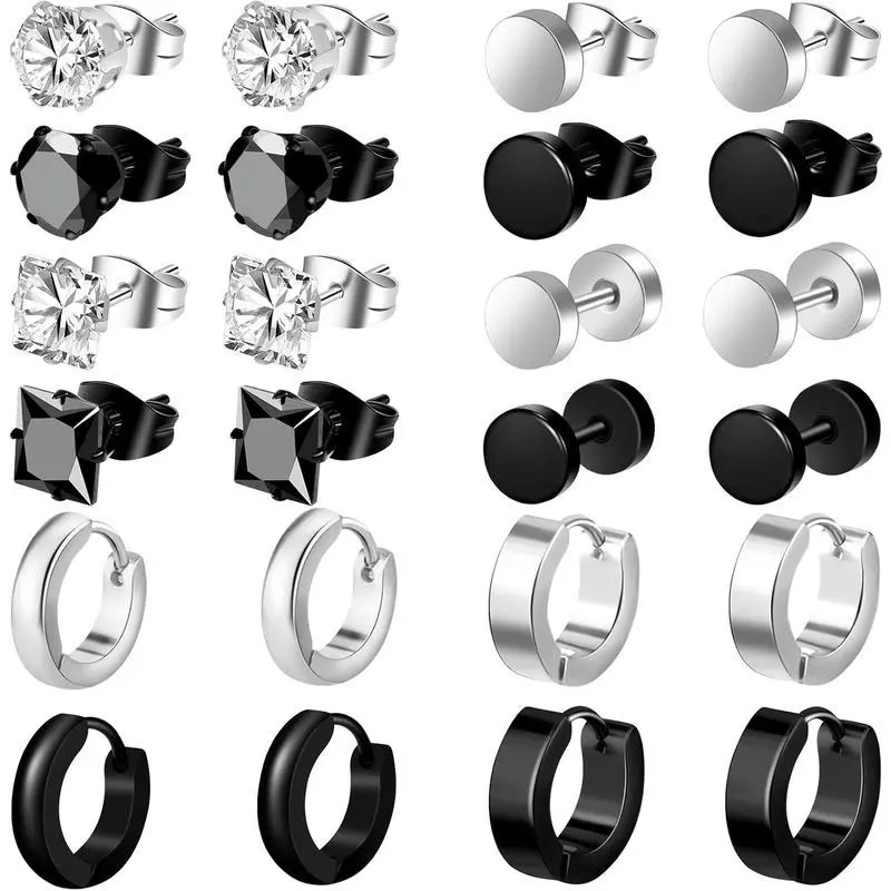 ��Complete Set����You will get a value earrings stud set (total 12 pairs in black and color), include 4 pairs studs earrings , 4 pairs black earrings stud. 2 paris black hoop earrings and 2 hoop earring. A variety of styles so super versatile. ��Safety Material���� Earrings for men are made of stainless steel and cubic zirconia, stianless steel is lightweight and gentle on ear holes, more comfortable. , not change color and long-lasting shiny, stud earrings with smooth surface for easily insertion and removal, and to . ��Various Size����Stainless steel stud earrings gauges: 20G(0.8mm); hoop earrings gauges: 18G(1mm); each pair has their own fashion and classic style, such as dangle-hinged hoops, square CZ earring, circles earrings , triangle stud earrings, flact earrings and other various shapes. Mens black earrings with various style for the one who loves to change up their look frequently. ��Multiple Occasions����Black/ earrings for men are full of personality and cool for daily wear or special event, really suit for anywhere you wanna to shine bright, like birthday parties, travels, appointments, festivals, weddings, business, dance parties, graduation, prom night and other important events. They are comfortable and very pretty on. �� ����Stainless steel earrings for men is a wonderful for everyone on an earrings journey, gifts for yourself, family, friends and lovers on Christmas Day, Anniversary Day, Valentine's Day, Birthday, etc. Earrings men allows for creativity and personal style expression. Whether you're going for a subtle look or something bold.