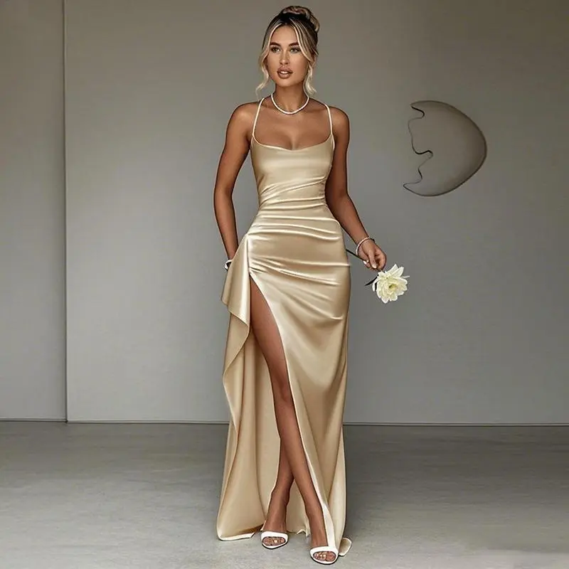 YL24531DGO-Womens Pleated Split Satin Evening Dress for Women Summer Formal Basic Maxi Dress