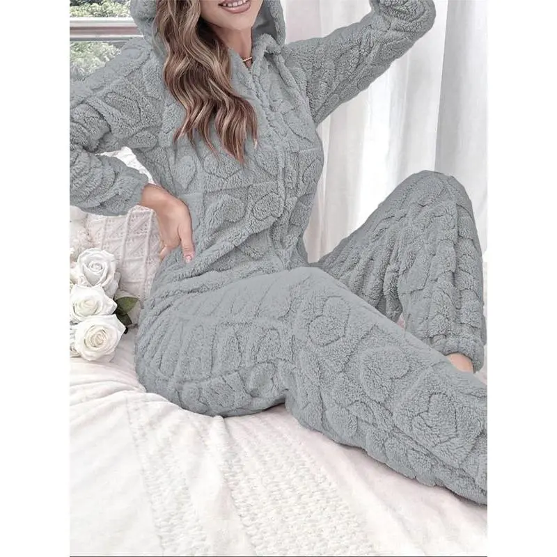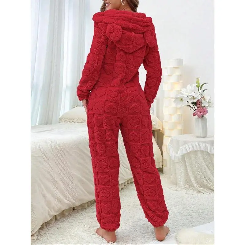 Women's Heart Jacquard Zip Up Hooded Sleep Jumpsuit, Casual Long Sleeve Jumpsuit for Fall & Winter, Women's Sleepwear for Indoor Wear??gift?? Womenswear LoungewearGift