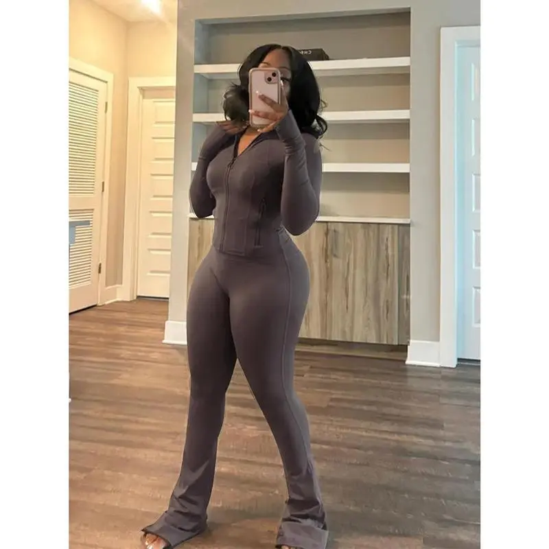 Two piece lounge set with comfortable zipper short jacket and flared pants sportswear | Elastic sportswear set suitable for family elastic sportswear
