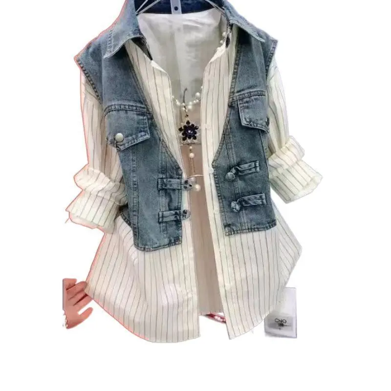 Design Striped Denim Jacket Shirt for Women Spring and Summer New Denim Stitching Fake Two Pieces Shirts Coat Top Women